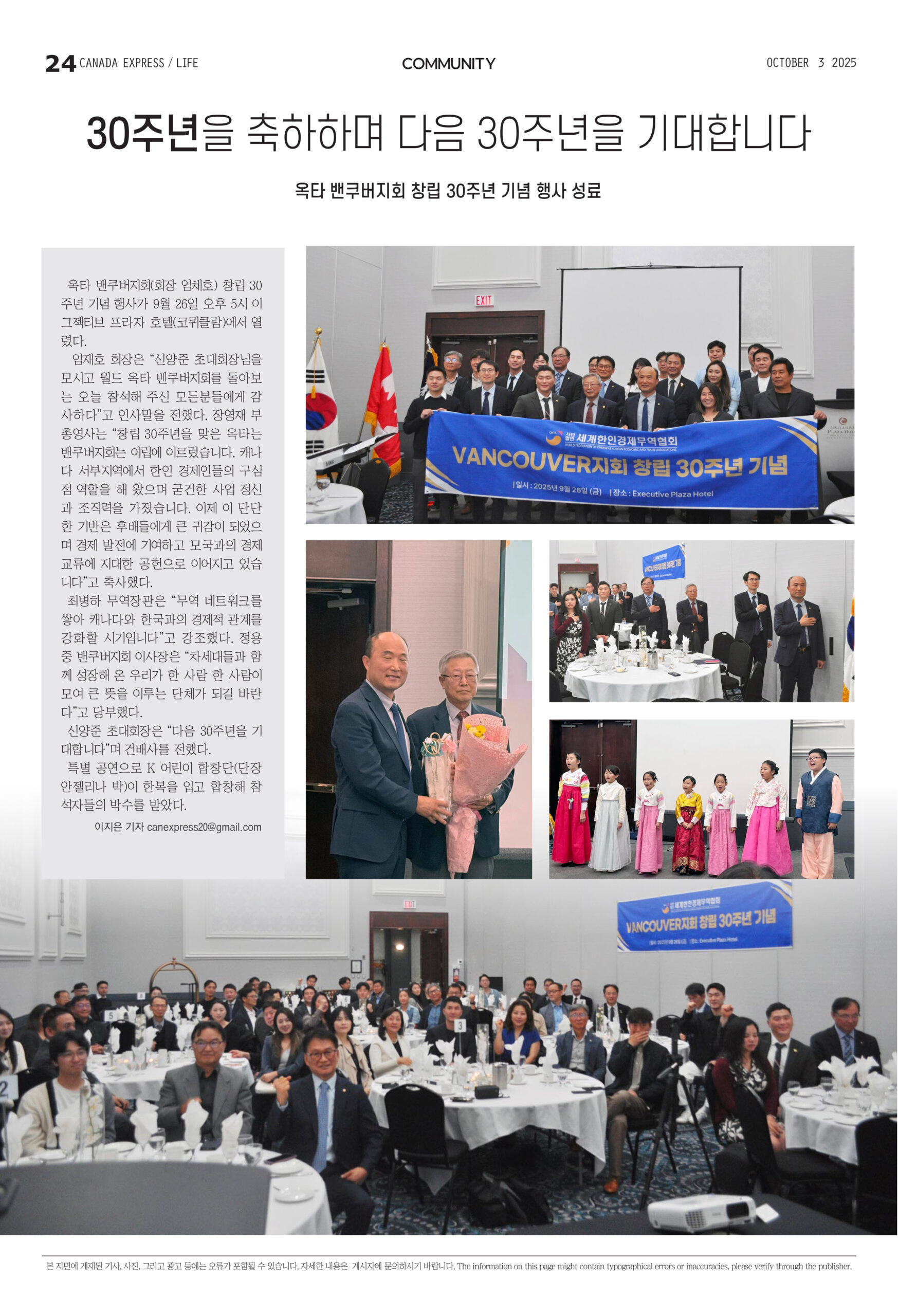옥타 밴쿠버지회(회장 임채호) 창립 30주년 기념 행사가 9월 26일 오후 5시 이그젝티브 프라자 호텔(코퀴클람)에서 열렸다.