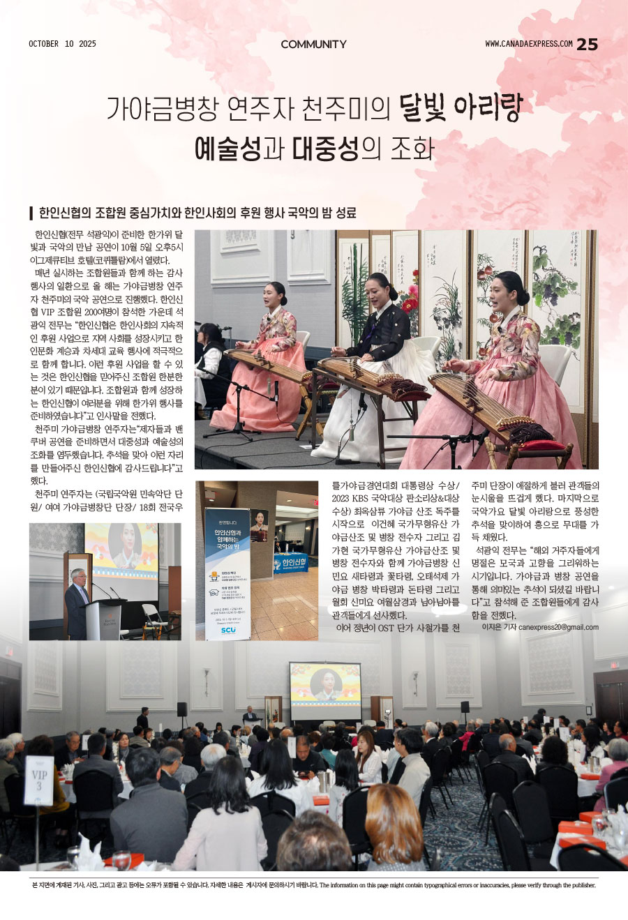 한인신협(전무 석광익)이 준비한 한가위 달빛과 국악의 만남 공연이 10월 5일 오후5시 이그제큐티브 호텔(코퀴틀람)에서 열렸다.