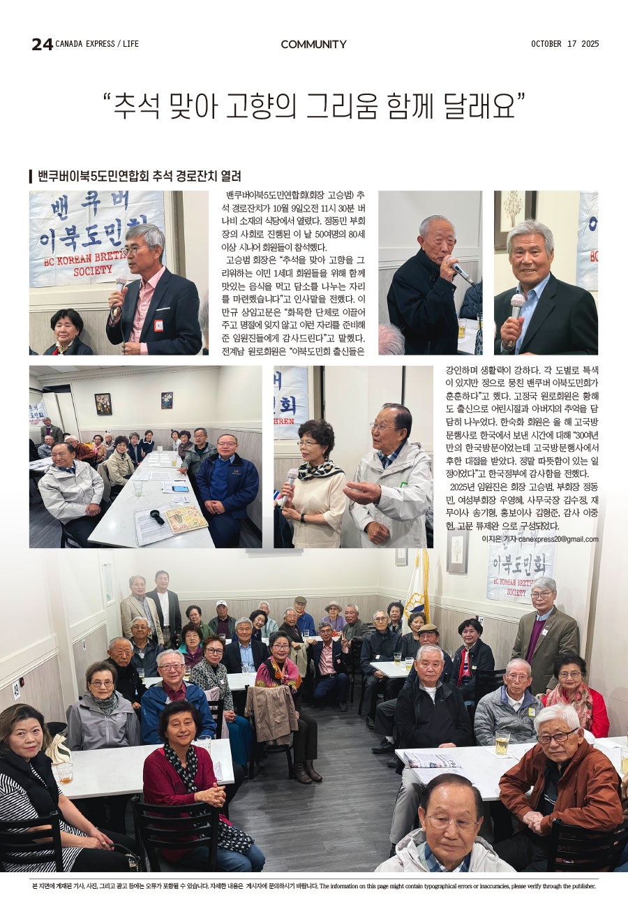 밴쿠버이북5도민연합회(회장 고승범) 추석 경로잔치가 10월 9일오전 11시 30분 버나비 소재의 식당에서 열렸다. 정동민 부회장의 사회로 진행된 이 날 50여명의 80세 이상 시니어 회원들이 참석했다.