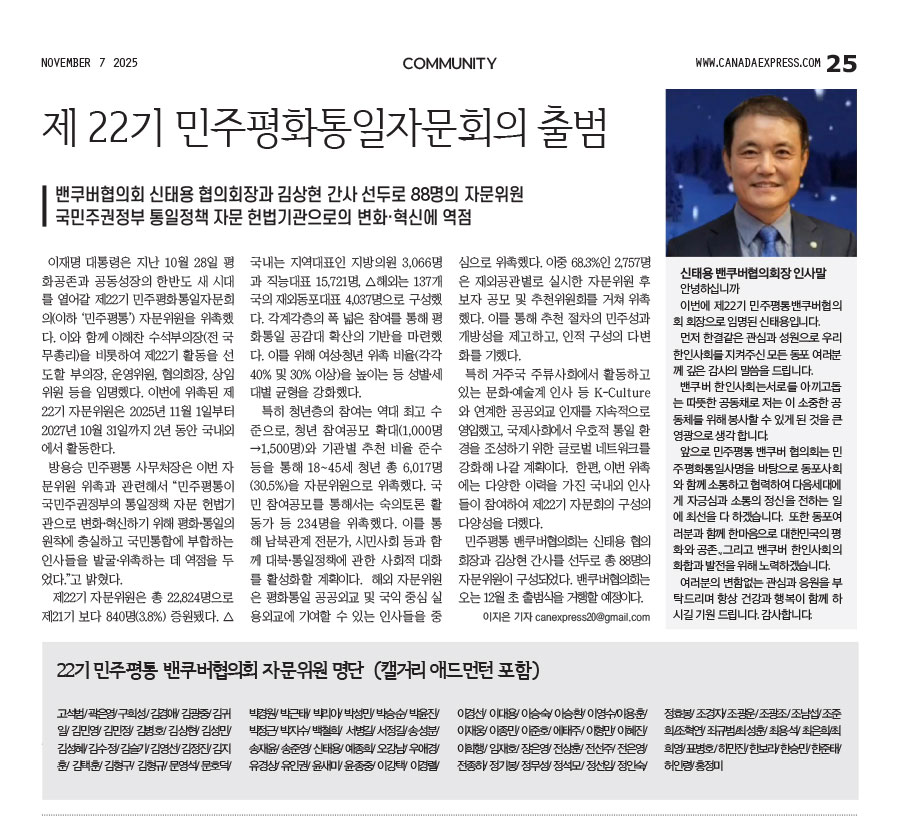 22기 민주평통 밴쿠버협의회 자문위원 명단 (캘거리 애드먼턴 포함)