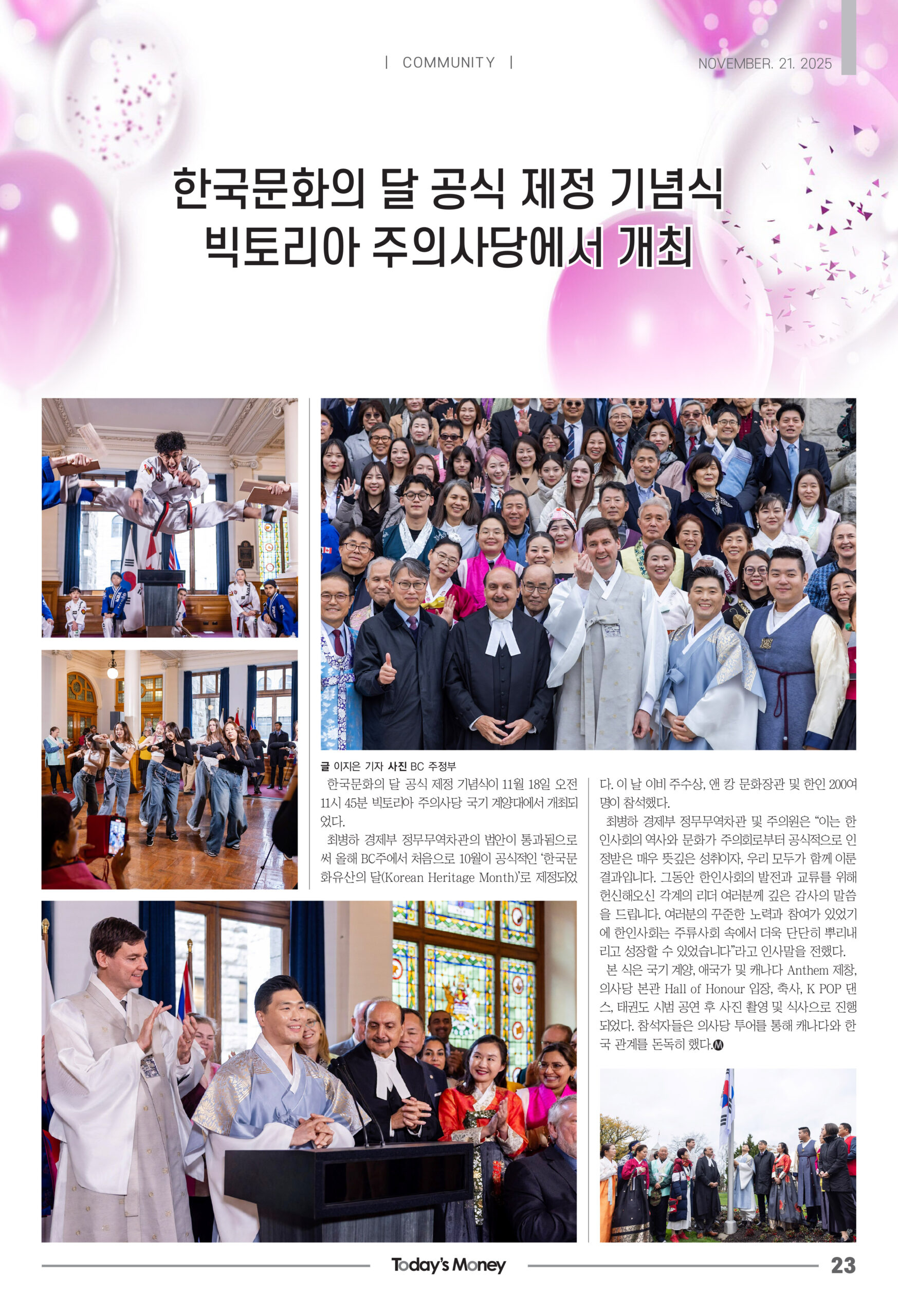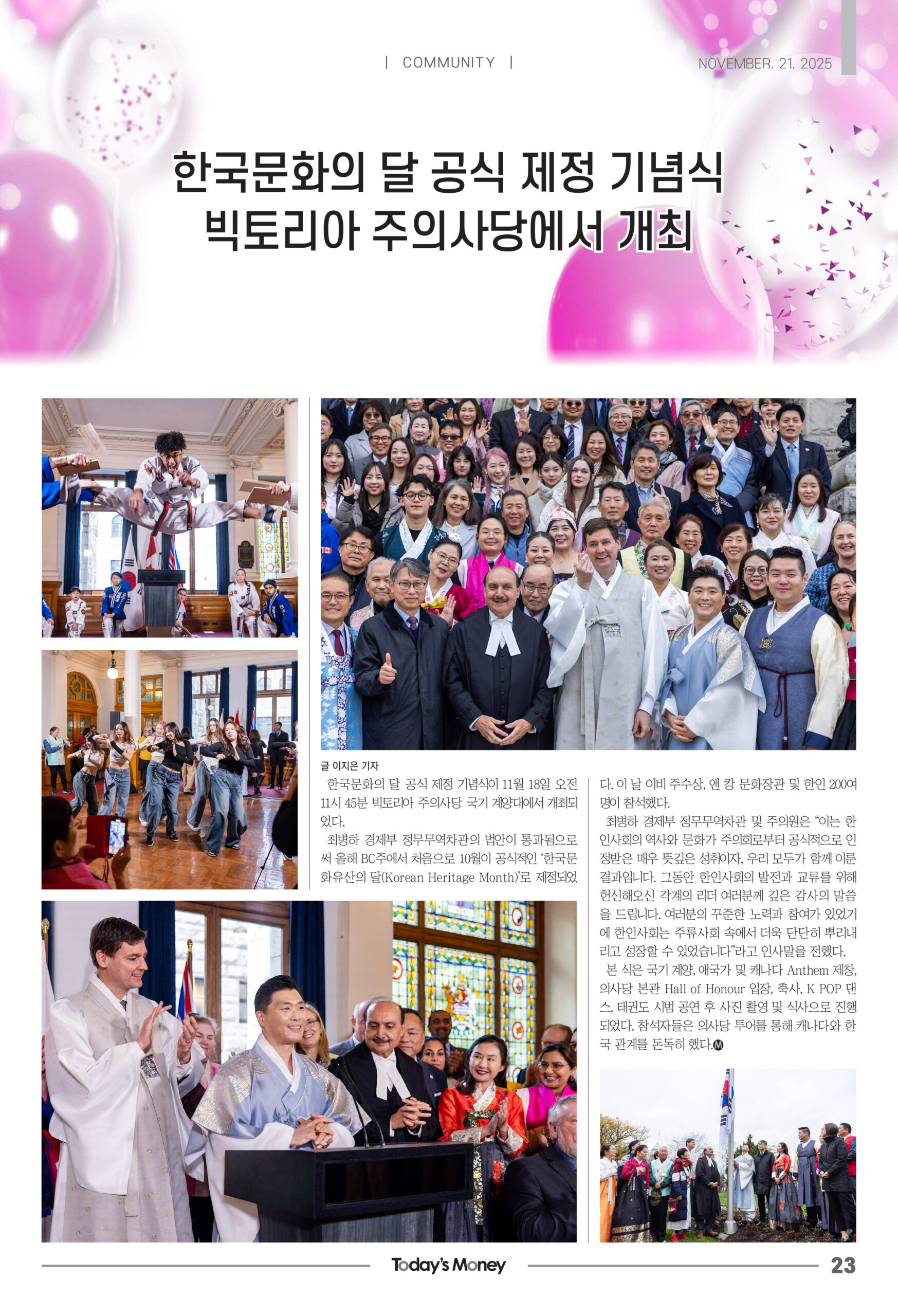 한국문화의 달 공식 제정 기념식이 11월 18일 오전 11시 45분 빅토리아 주의사당 국기 계양대에서 개최되었다. 최병하 경제부 정무무역차관의 법안이 통과됨으로써 올해 BC주에서 처음으로 10월이 공식적인 ‘한국문화유산의 달(Korean Heritage Month)’로 제정되었다. 이 날 이비 주수상, 앤 캉 문화장관 및 한인 200여명이 참석했다.
