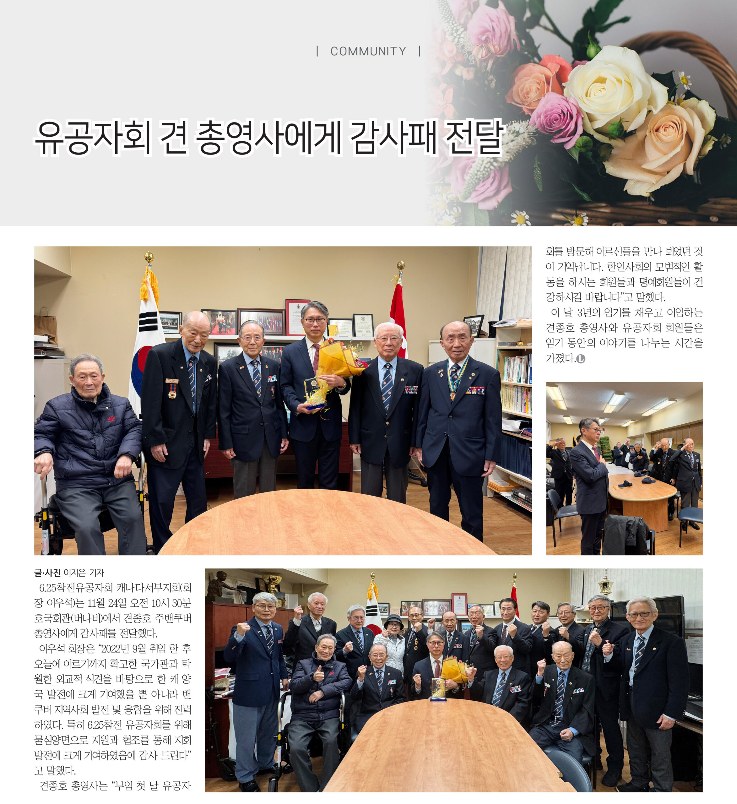 6.25참전유공자회 캐나다서부지회(회장 이우석)는 11월 24일 오전 10시 30분 호국회관(버나비)에서 견종호 주밴쿠버총영사에게 감사패를 전달했다.