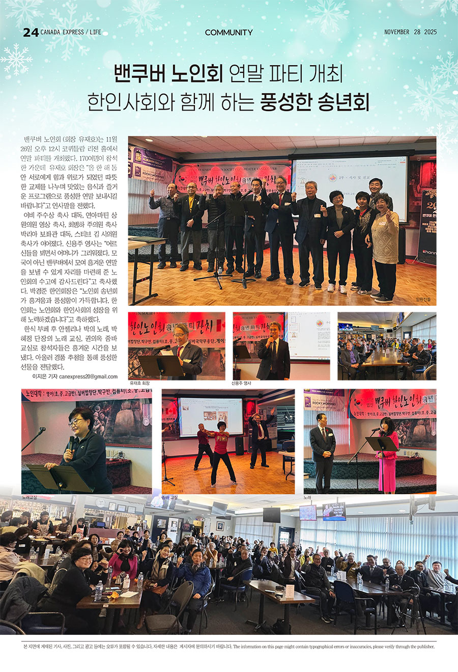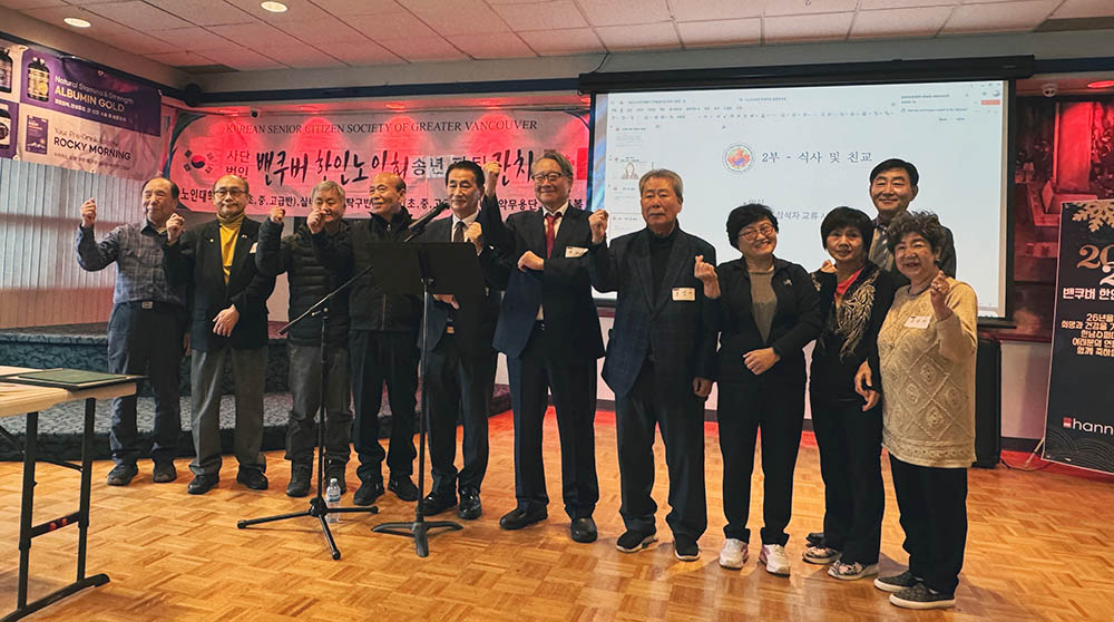 밴쿠버 노인회 (회장 유재호)는 11월 26일 오후 12시 코퀴틀람 리전 홀에서 연말 파티를 개최했다. 170여명이 참석한 가운데 유재호 회장은 “올 한 해 동안 서로에게 힘과 위로가 되었던 따뜻한 교제를 나누며 맛있는 음식과 즐거운 프로그램으로 풍성한 연말 보내시길 바랍니다”고 인사말을 전했다.