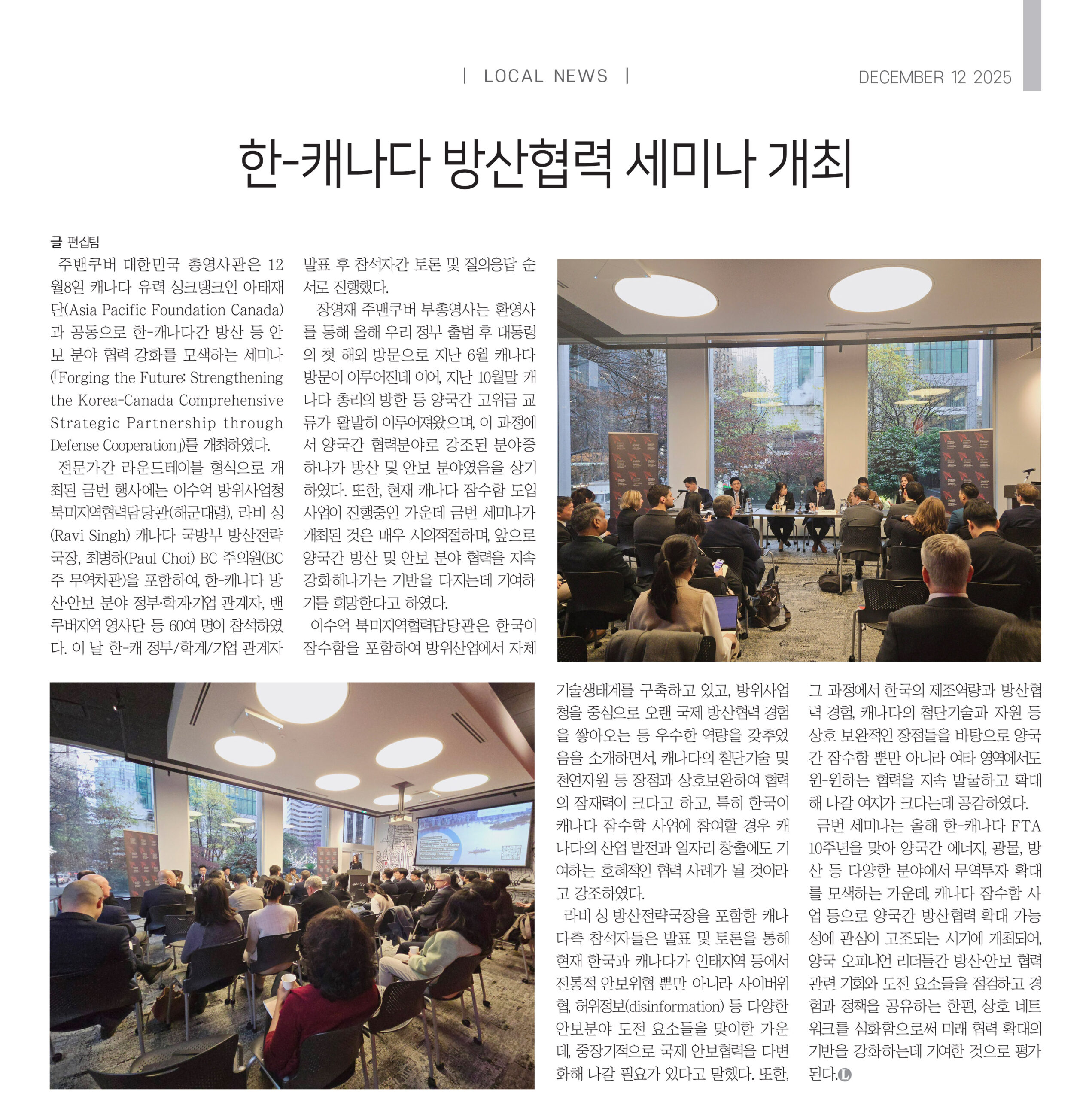 주밴쿠버 대한민국 총영사관은 12월8일 캐나다 유력 싱크탱크인 아태재단(Asia Pacific Foundation Canada)과 공동으로 한-캐나다간 방산 등 안보 분야 협력 강화를 모색하는 세미나(「Forging the Future: Strengthening the Korea-Canada Comprehensive Strategic Partnership through Defense Cooperation」)를 개최하였다.