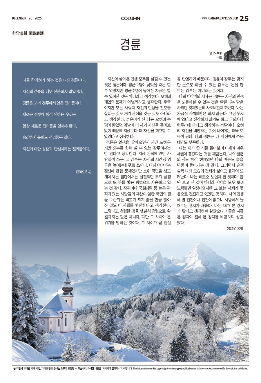 나의 이야기의 시작은 경륜은 자신의 인생을 되돌아볼 수 있는 것을 말한다는 말을 하려던 것이었는데 사회비판이 되었다. 나는 가급적 사회비판은 하지 않는다. 그런 위치에 있다고 생각하지 않기도 하고 국외자나 변두리에 산다고 생각하는 까닭이다. 오히려 자신을 비판하는 것이 나에게는 더욱 도움이 된다. 나의 경륜은 나 자신에게 쓰는 데만도 부족하다.