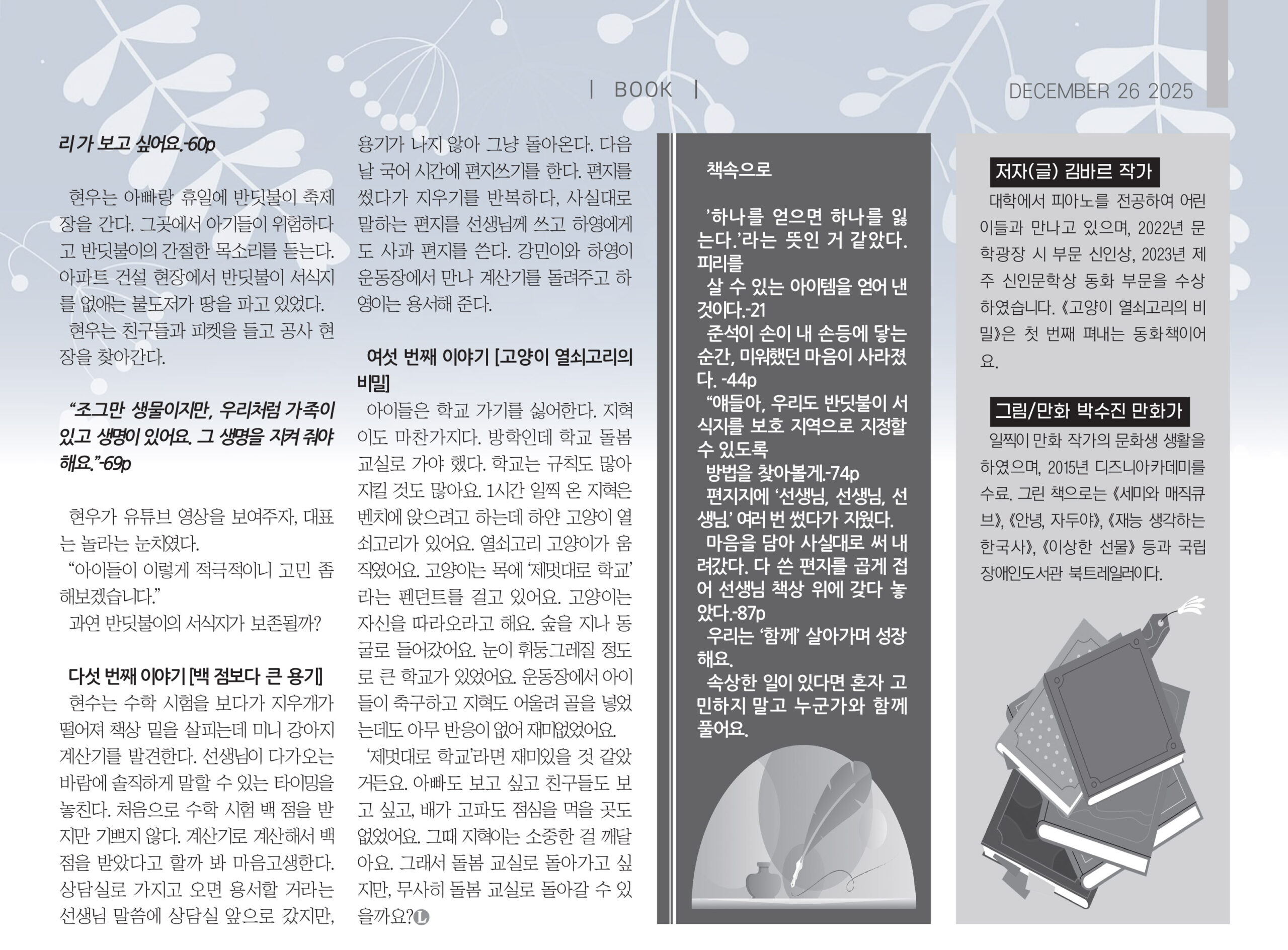 ‘주인공들은 고민을 나누고 갈등을 해결하며, 그 속에서 조금씩 성장해 가지요. 여러분도 속상한 일이 있다면 혼자 고민하지 말고 누군가와 함께 풀어 가요. 그러면 마음이 가벼워지고 성장의 씨앗이 더 단단하게 자랄 거예요.’_작가의 말 중에서