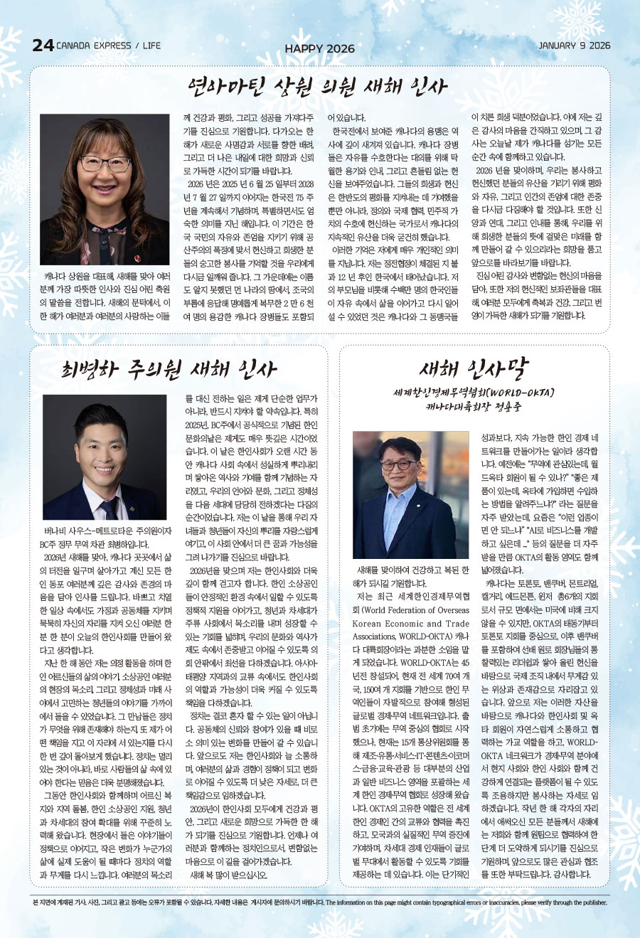 2026년 새해를 맞아, 캐나다 곳곳에서 삶의 터전을 일구며 살아가고 계신 모든 한인 동포 여러분께 깊은 감사와 존경의 마음을 담아 인사를 드립니다. 바쁘고 치열한 일상 속에서도 가정과 공동체를 지키며 묵묵히 자신의 자리를 지켜 오신 여러분 한 분 한 분이 오늘의 한인사회를 만들어 왔다고 생각합니다.