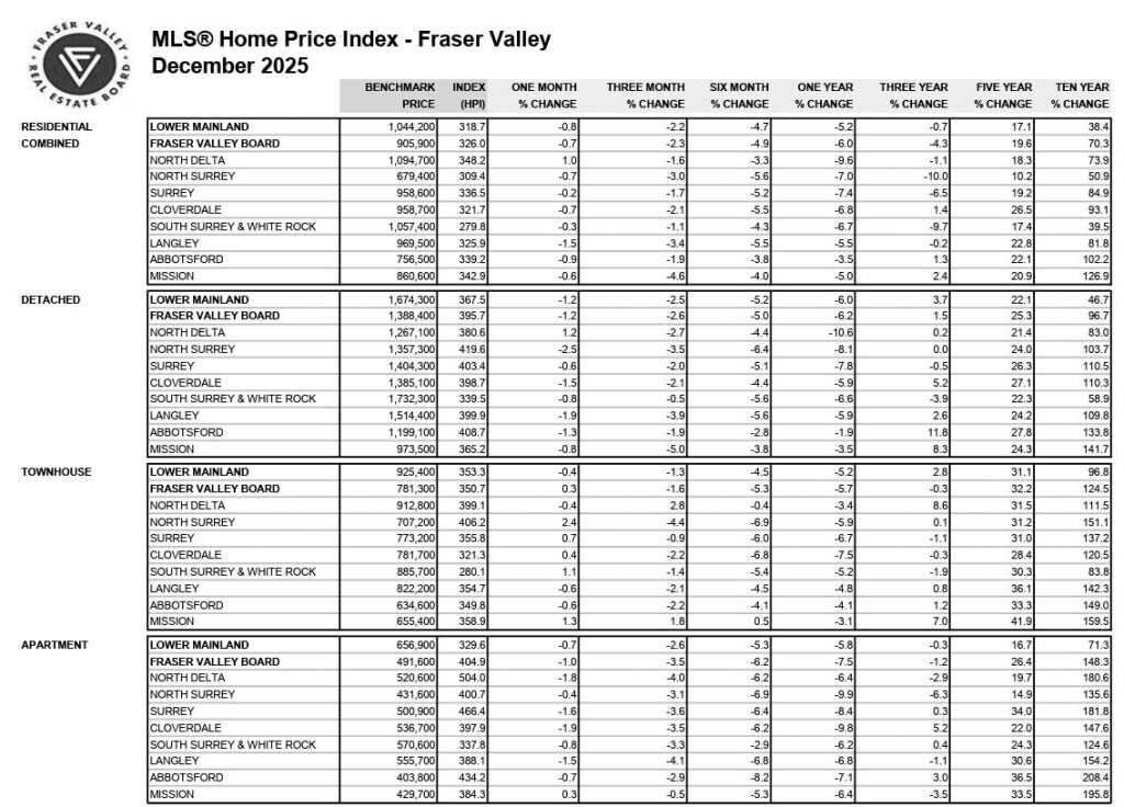 프레이저 밸리 전체 주택의 종합 기준가격은 연말 기준 90만5,900달러로 마감됐다. 이는 전년 대비 6% 하락한 수치이며, 2022년 3월 정점 대비로는 24% 낮은 수준이다.