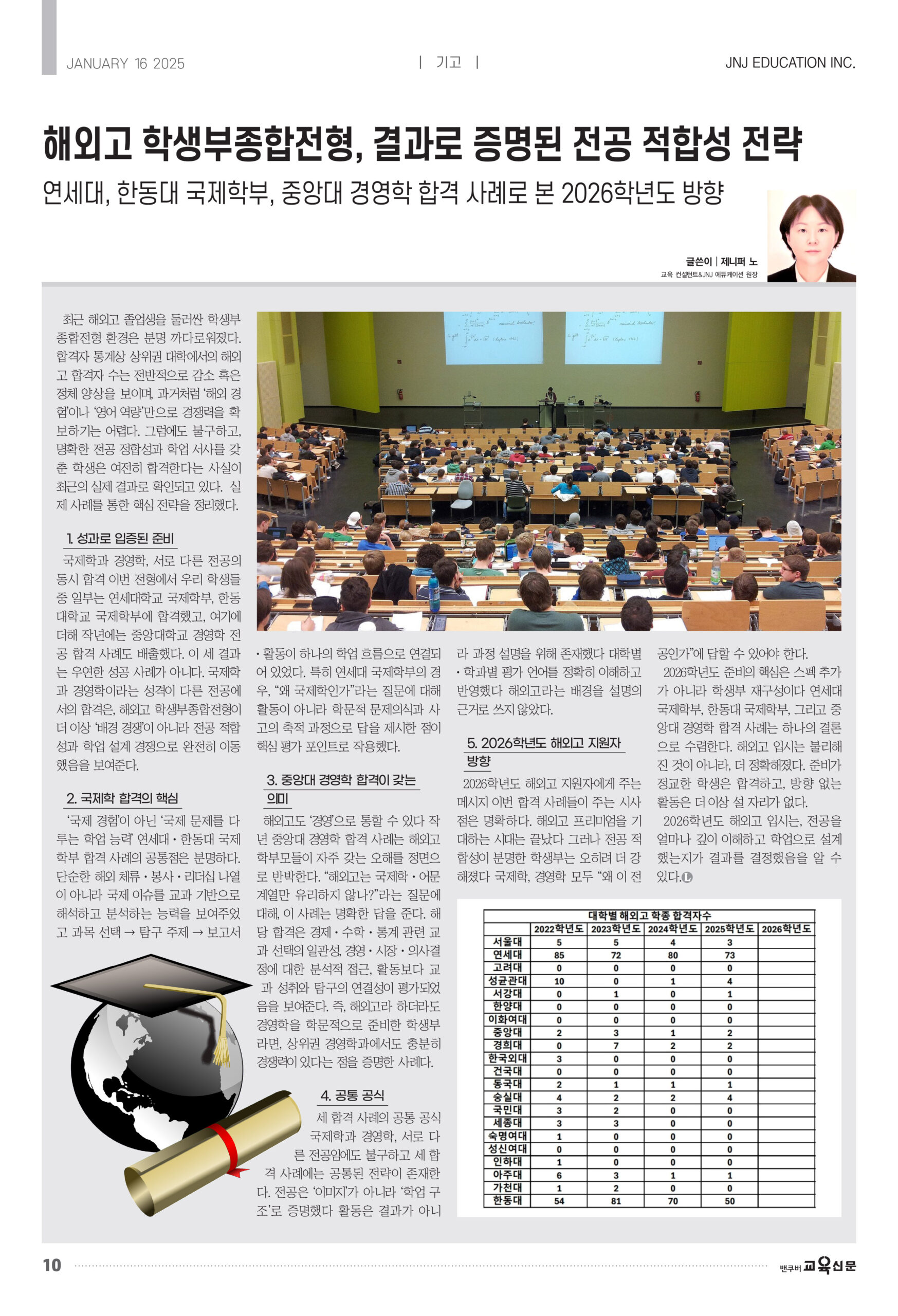 국제학과 경영학, 서로 다른 전공의 동시 합격 이번 전형에서 우리 학생들 중 일부는 연세대학교 국제학부, 한동대학교 국제학부에 합격했고, 여기에 더해 작년에는 중앙대학교 경영학 전공 합격 사례도 배출했다. 이 세 결과는 우연한 성공 사례가 아니다. 국제학과 경영학이라는 성격이 다른 전공에서의 합격은, 해외고 학생부종합전형이 더 이상 ‘배경 경쟁’이 아니라 전공 적합성과 학업 설계 경쟁으로 완전히 이동했음을 보여준다.