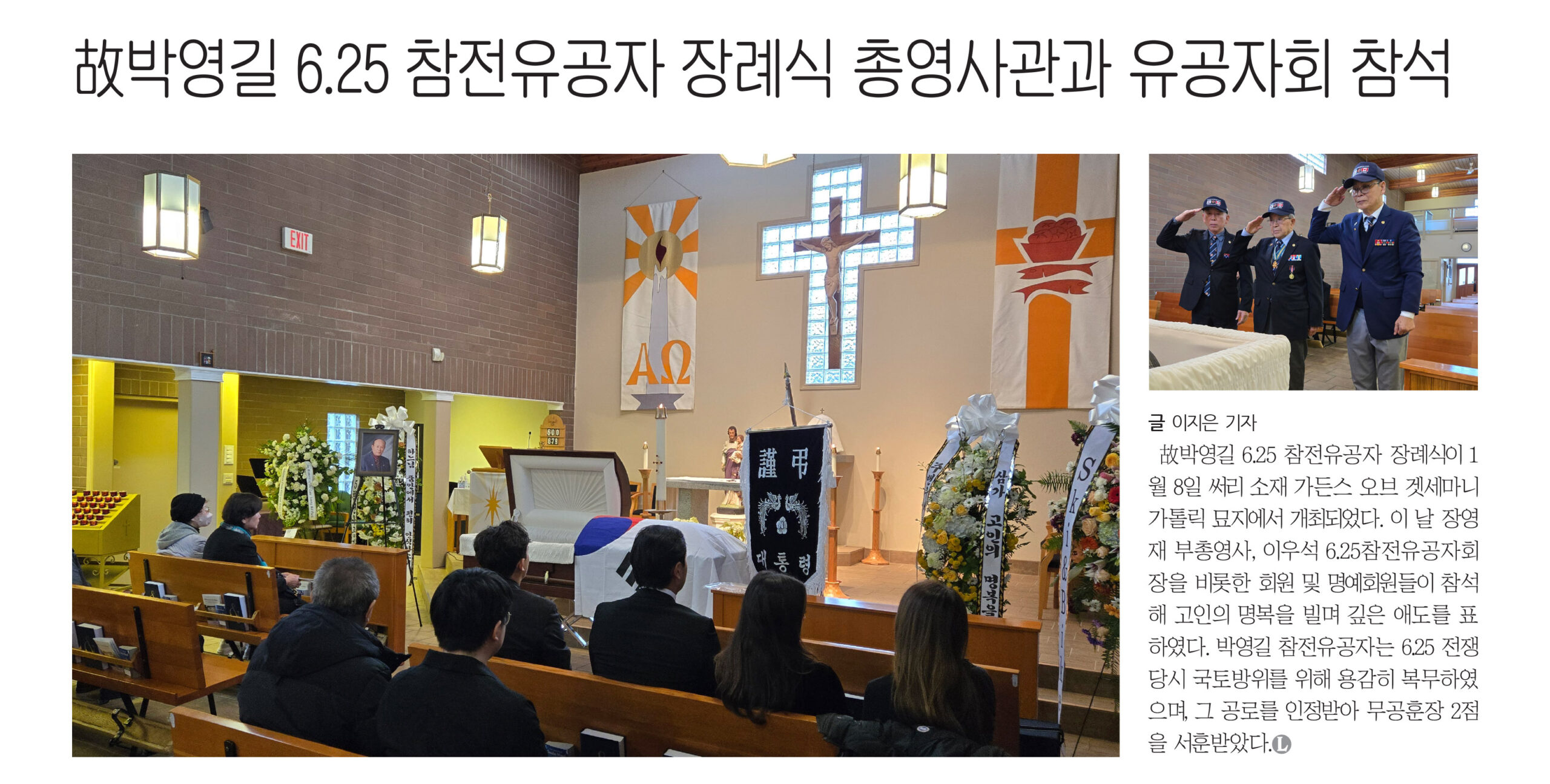故박영길 6.25 참전유공자 장례식 총영사관과 유공자회 참석 글 이지은 기자 故박영길 6.25 참전유공자 장례식이 1월 8일 써리 소재 가든스 오브 겟세마니 가톨릭 묘지에서 개최되었다. 이 날 장영재 부총영사, 이우석 6.25참전유공자회장을 비롯한 회원 및 명예회원들이 참석해 고인의 명복을 빌며 깊은 애도를 표하였다. 박영길 참전유공자는 6.25 전쟁 당시 국토방위를 위해 용감히 복무하였으며, 그 공로를 인정받아 무공훈장 2점을 서훈받았다. Facebook Twitter Gmail 관련기사: 유공자회 송년 잔치 열려… 건강하세요 유공자회 김태영 전회장에게 공로상 수여 유공자회 강영구 한인회장에게 감사장 수여
