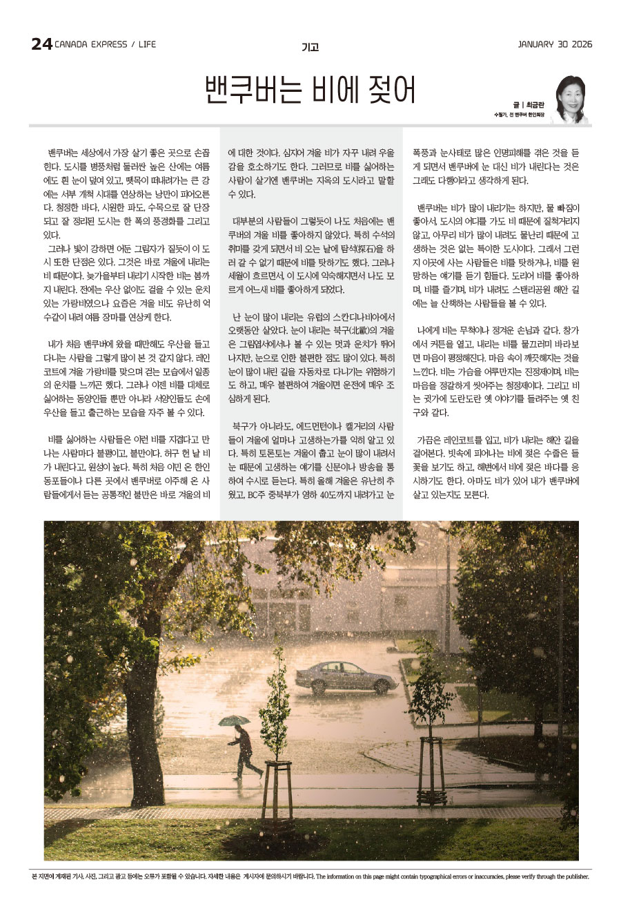 북구가 아니라도, 에드먼턴이나 캘거리의 사람들이 겨울에 얼마나 고생하는가를 익히 알고 있다. 특히 토론토는 겨울이 춥고 눈이 많이 내려서 눈 때문에 고생하는 얘기를 신문이나 방송을 통하여 수시로 듣는다. 특히 올해 겨울은 유난히 추웠고, BC주 중북부가 영하 40도까지 내려가고 눈 폭풍과 눈사태로 많은 인명피해를 겪은 것을 듣게 되면서 밴쿠버에 눈 대신 비가 내린다는 것은 그래도 다행이라고 생각하게 된다.