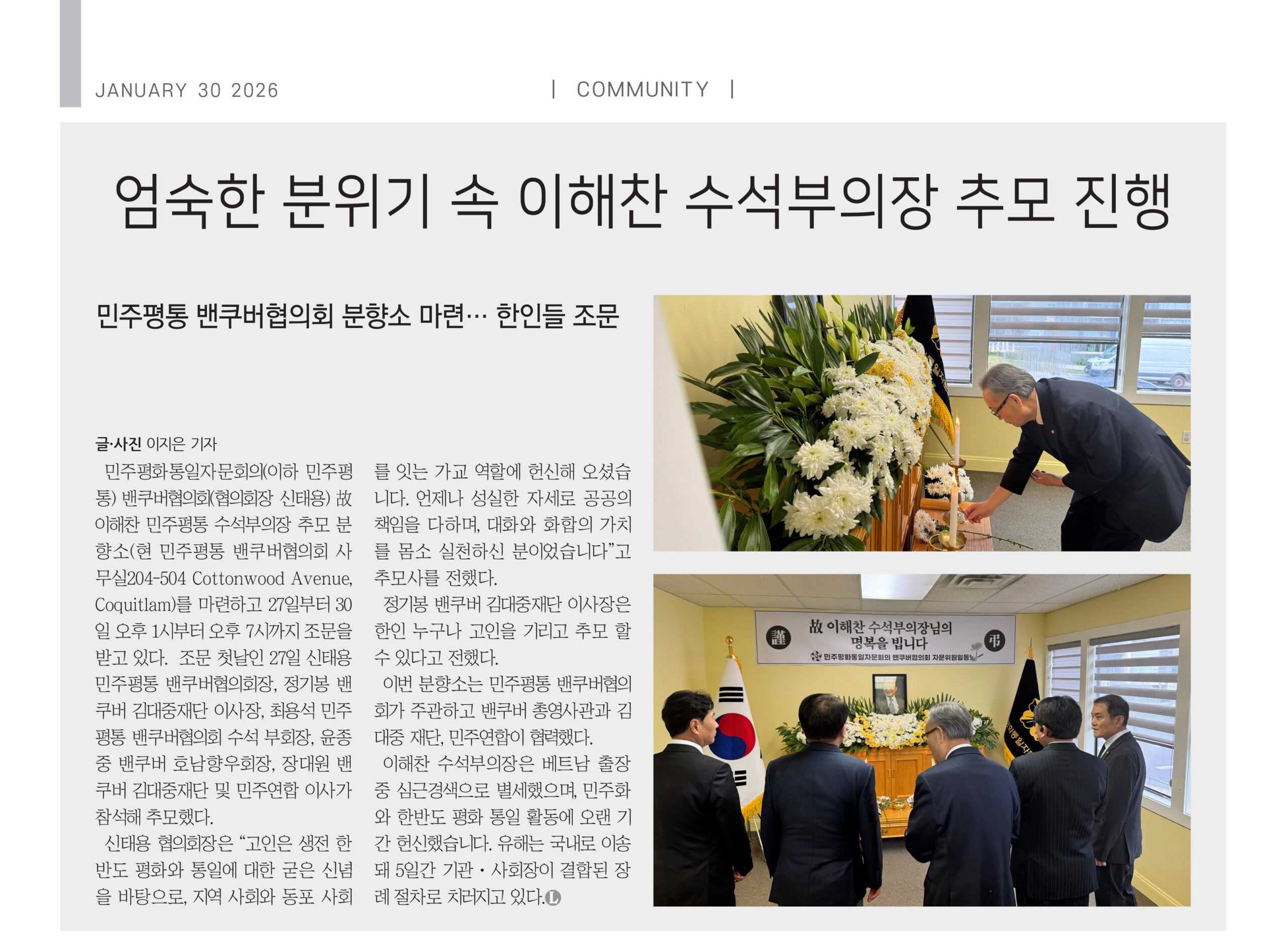 민주평화통일자문회의(이하 민주평통) 밴쿠버협의회(협의회장 신태용) 故 이해찬 민주평통 수석부의장 추모 분향소(현 민주평통 밴쿠버협의회 사무실204-504 Cottonwood Avenue, Coquitlam)를 마련하고 27일부터 30일 오후 1시부터 오후 7시까지 조문을 받고 있다. 조문 첫날인 27일 신태용 민주평통 밴쿠버협의회장, 정기봉 밴쿠버 김대중재단 이사장, 최용석 민주평통 밴쿠버협의회 수석 부회장, 윤종중 밴쿠버 호남향우회장, 장대원 밴쿠버 김대중재단 및 민주연합 이사가 참석해 추모했다.