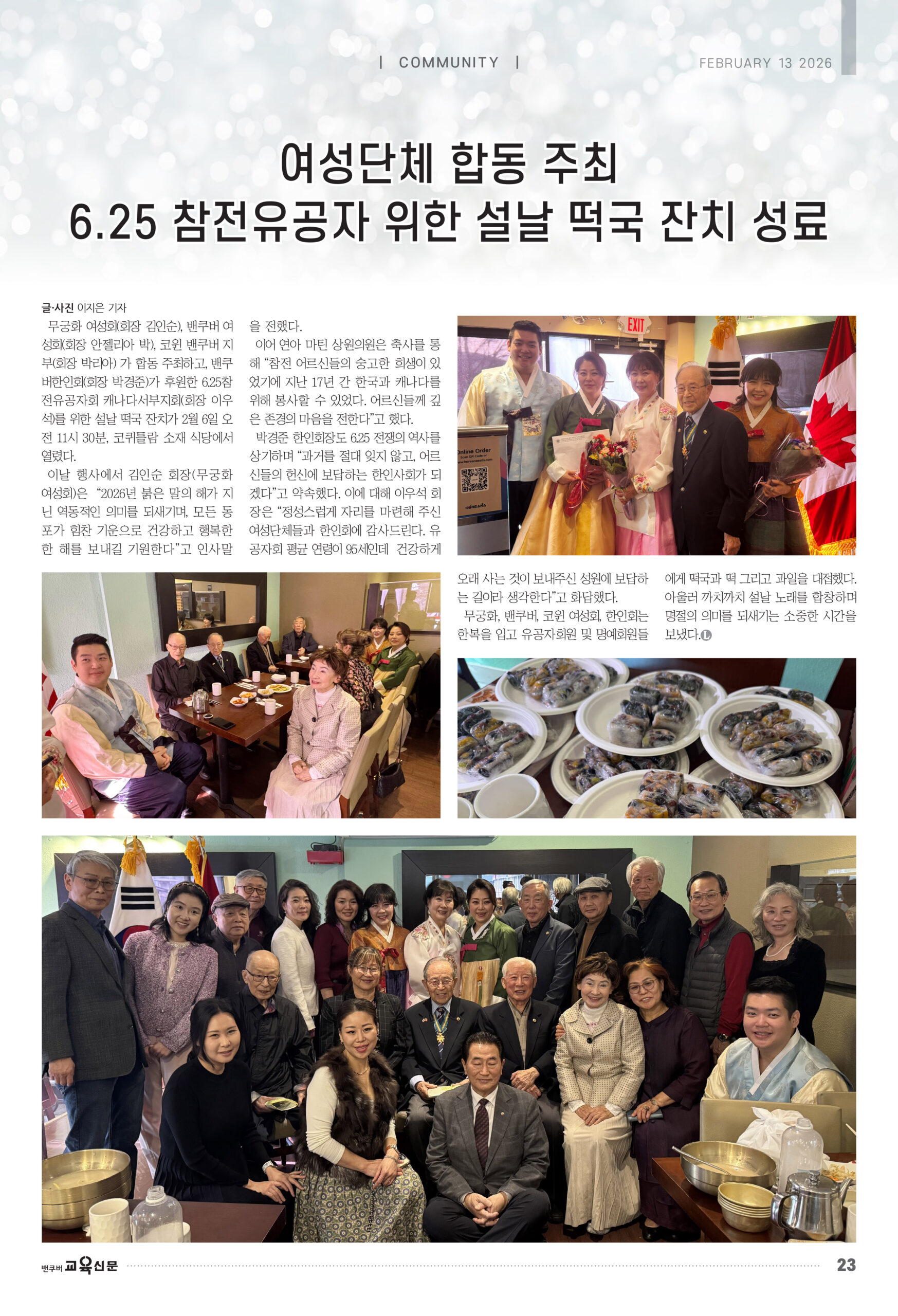 무궁화 여성회(회장 김인순), 밴쿠버 여성회(회장 안젤리아 박), 코윈 밴쿠버 지부(회장 박리아) 가 합동 주최하고, 밴쿠버한인회(회장 박경준)가 후원한 6.25참전유공자회 캐나다서부지회(회장 이우석)를 위한 설날 떡국 잔치가 2월 6일 오전 11시 30분, 코퀴틀람 소재 식당에서 열렸다.