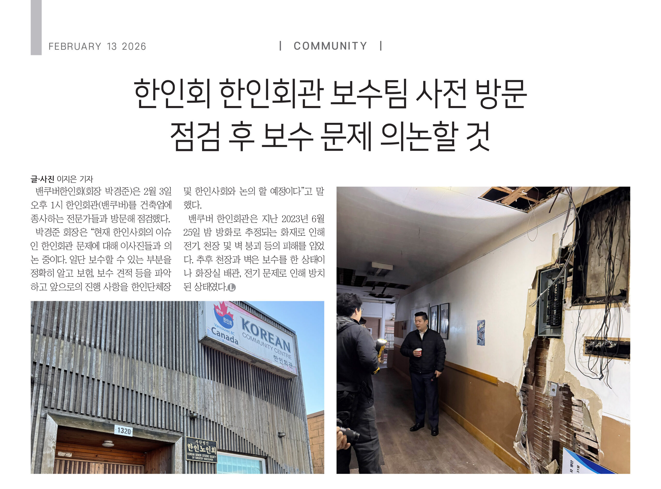 밴쿠버한인회(회장 박경준)은 2월 3일 오후 1시 한인회관(밴쿠버)를 건축업에 종사하는 전문가들과 방문해 점검했다.