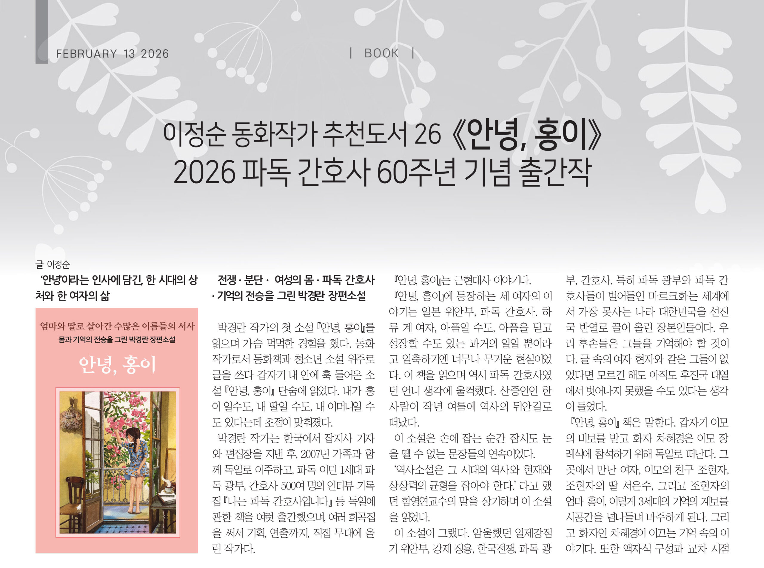 『안녕, 홍이』에 등장하는 세 여자의 이야기는 일본 위안부, 파독 간호사. 하류 계 여자, 아픔일 수도, 아픔을 딛고 성장할 수도 있는 과거의 일일 뿐이라고 일축하기엔 너무나 무거운 현실이었다. 이 책을 읽으며 역시 파독 간호사였던 언니 생각에 울컥했다. 산증인인 한 사람이 작년 여름에 역사의 뒤안길로 떠났다.