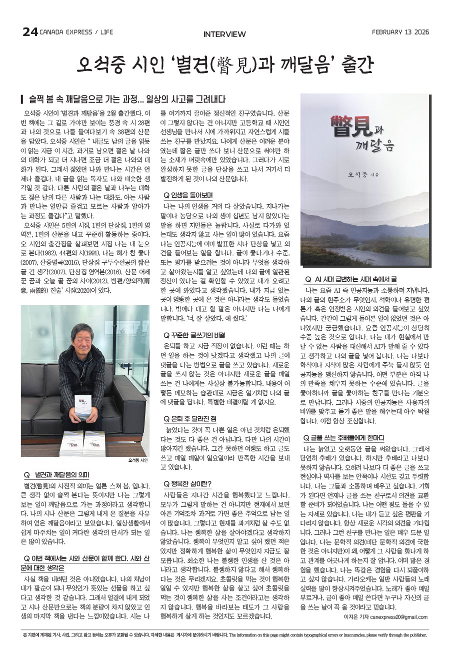오석중 시인이 ‘별견과 깨달음’을 2월 출간했다. 이번 책에는 그 길로 가야만 보이는 풍경 속 시 28편과 나의 것으로 나를 들여다보기 속 38편의 산문을 담았다. 오석중 시인은 “ 내글도 남의 글을 읽듯이 읽는 지금 이 시간, 과거로 남으면 젊은 날 나와의 대화가 되고 더 지나면 조금 더 젊은 나와의 대화가 된다. 그래서 젊었던 나와 만나는 시간은 언제나 즐겁다. 내 글을 읽는 독자도 나와 비슷한 생각일 것 같다. 다른 사람의 젊은 날과 나누는 대화도 젊은 날의 다른 사람과 나는 대화도. 아는 사람과 만나는 일만큼 즐겁고 모르는 사람과 알아가는 과정도 즐겁다”고 말했다.