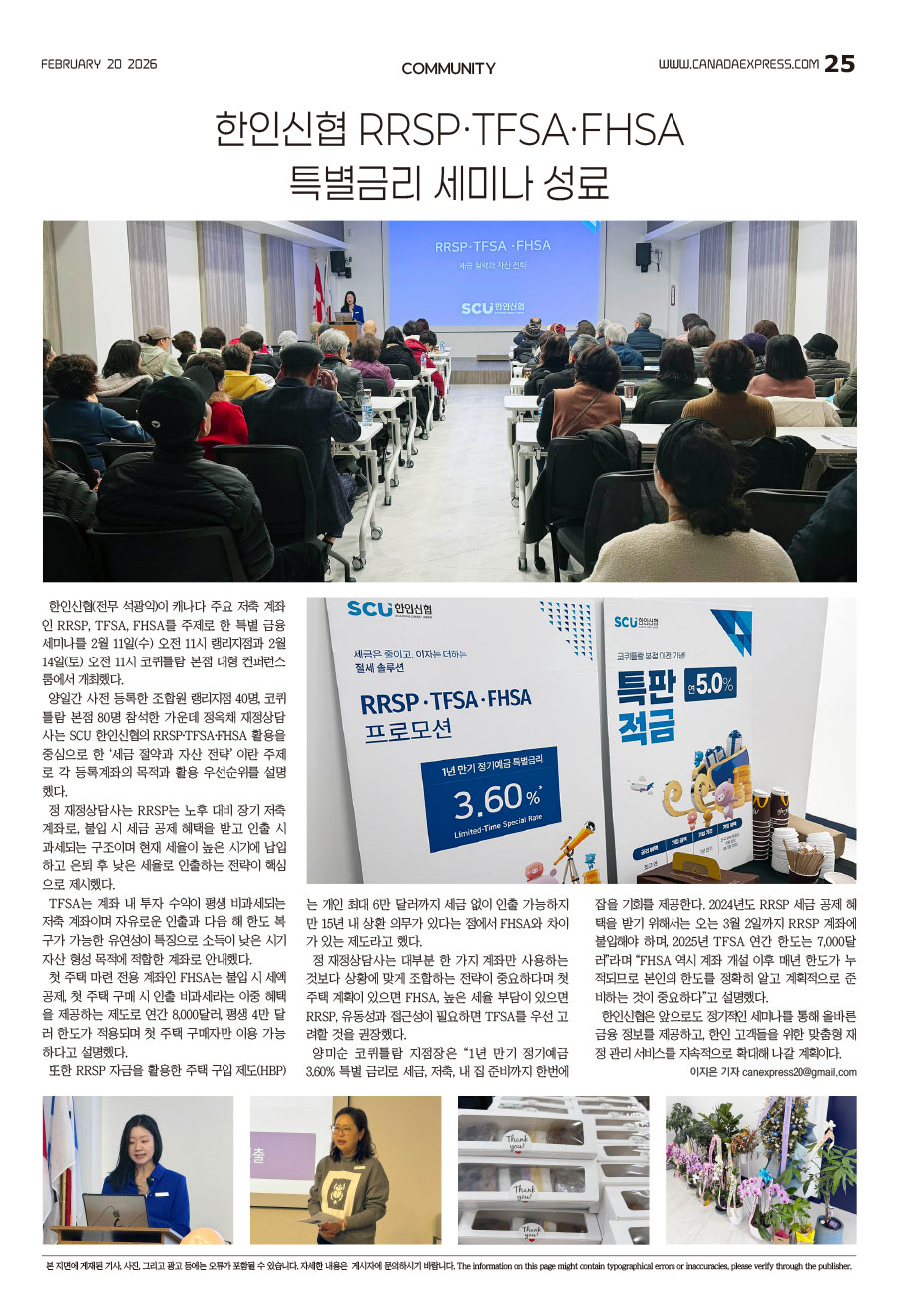 한인신협(전무 석광익)이 캐나다 주요 저축 계좌인 RRSP, TFSA, FHSA를 주제로 한 특별 금융 세미나를 2월 11일(수) 오전 11시 랭리지점과 2월 14일(토) 오전 11시 코퀴틀람 본점 대형 컨퍼런스룸에서 개최했다.