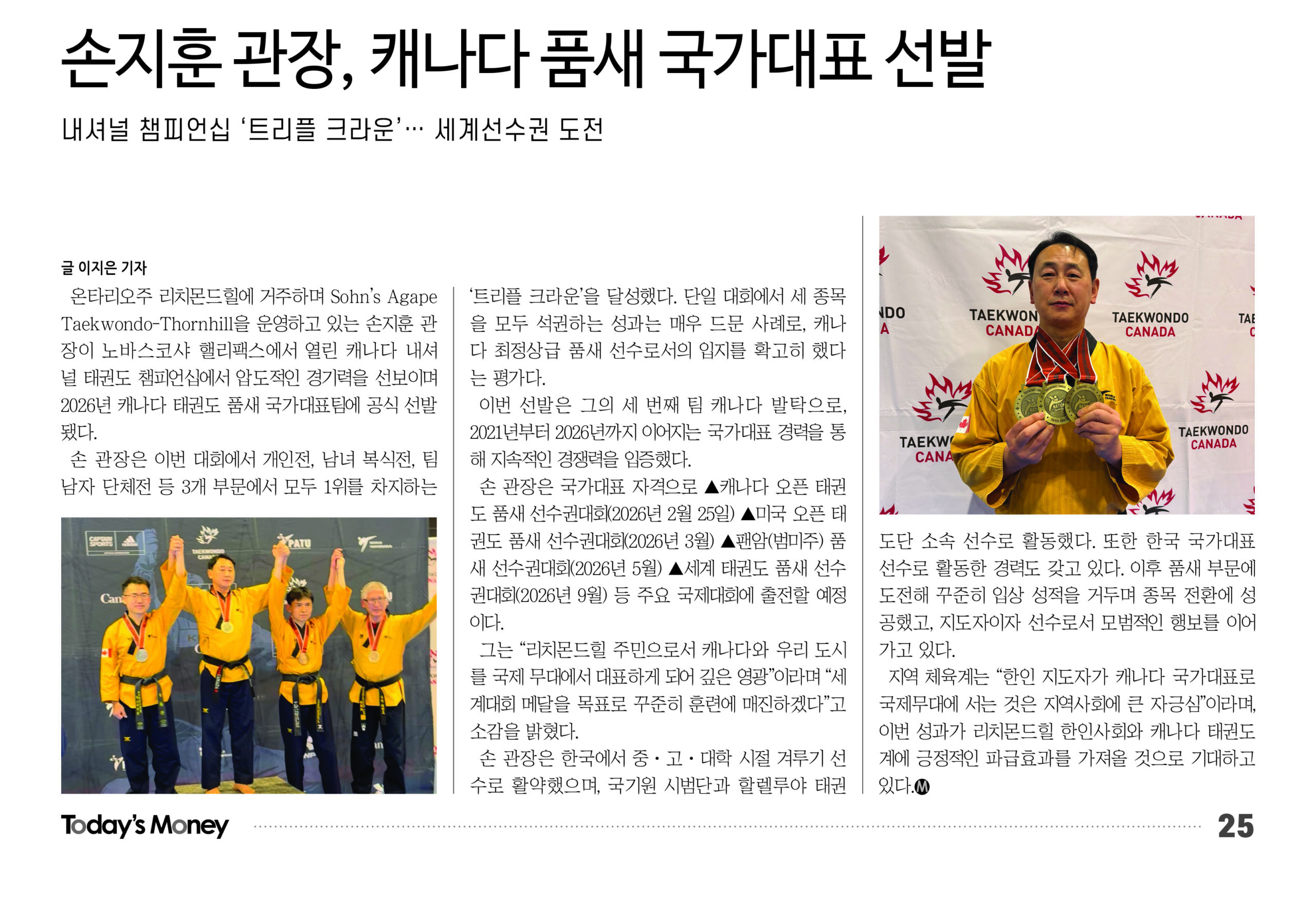 온타리오주 리치몬드힐에 거주하며 Sohn’s Agape Taekwondo-Thornhill을 운영하고 있는 손지훈 관장이 노바스코샤 핼리팩스에서 열린 캐나다 내셔널 태권도 챔피언십에서 압도적인 경기력을 선보이며 2026년 캐나다 태권도 품새 국가대표팀에 공식 선발됐다.