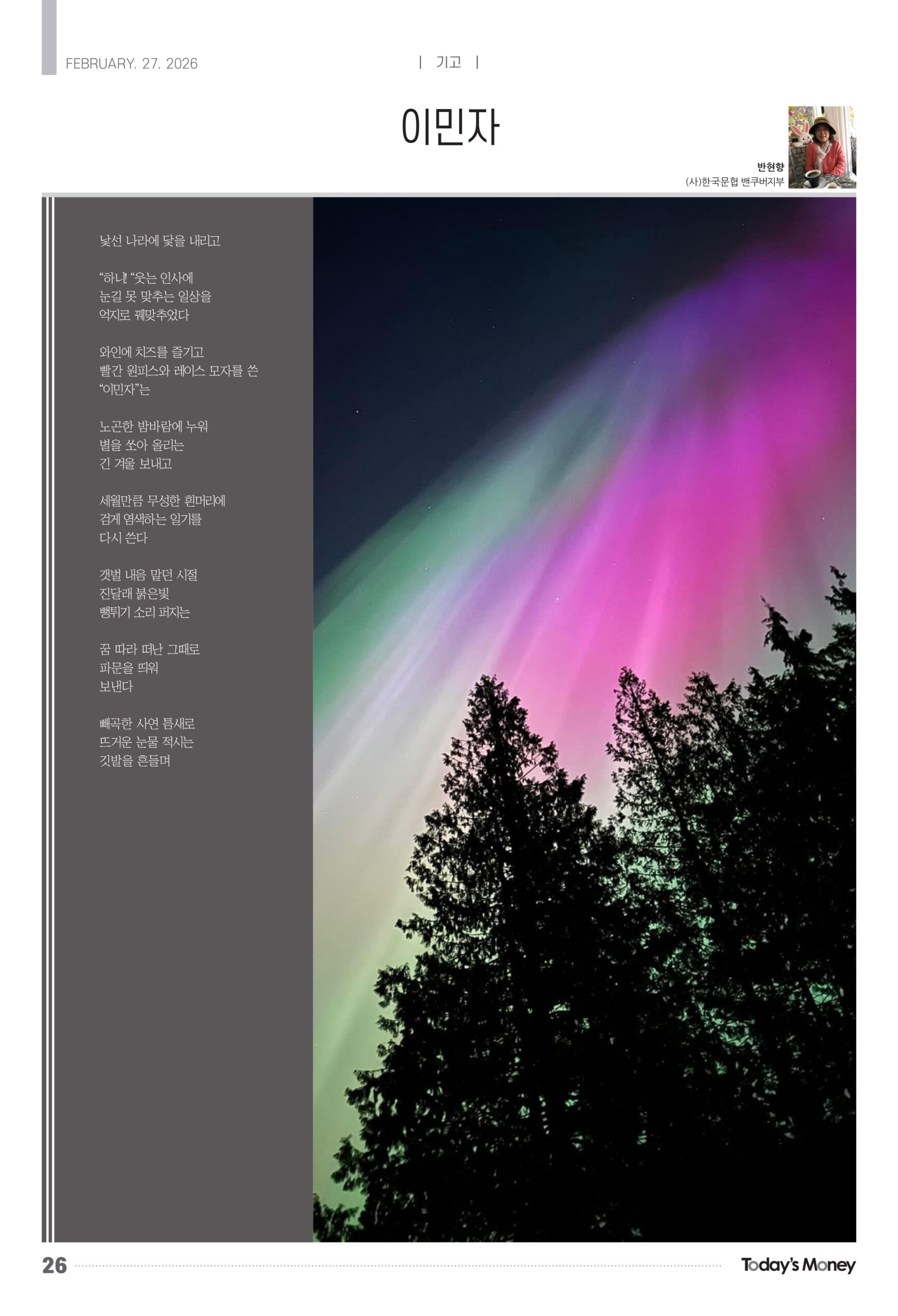 이민자 / 반현향 낯선 나라에 닻을 내리고 “하니! “웃는 인사에 눈길 못 맞추는 일상을 억지로 꿰맞추었다 와인에 치즈를 즐기고 빨간 원피스와 레이스 모자를 쓴 “이민자”는 노곤한 밤바람에 누워별을 쏘아 올리는 긴 겨울 보내고 세월만큼 무성한 흰머리에 검게 염색하는 일기를 다시 쓴다 갯벌 내음 맡던 시절 진달래 붉은빛 뻥튀기 소리 퍼지는 꿈 따라 떠난 그때로 파문을 띄워 보낸다 빼곡한 사연 틈새로 뜨거운 눈물 적시는 깃발을 흔들며 Facebook Twitter Gmail 관련기사: 2026년 한국 경제, ‘돈 풀기’로 버틸 수 있나 주정부 이민자 수용 대폭 축소…올해 신규 신청 1,100건 불과 늘푸른 장년회, 다양한 강좌로 새해를 연다