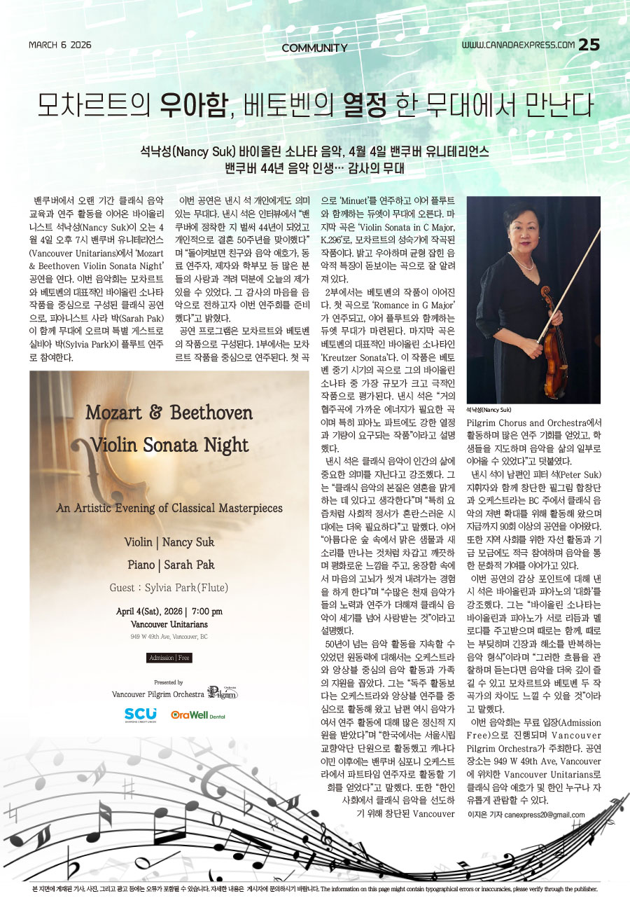 밴쿠버에서 오랜 기간 클래식 음악 교육과 연주 활동을 이어온 바이올리니스트 석낙성(Nancy Suk)이 오는 4월 4일 오후 7시 밴쿠버 유니테리언스(Vancouver Unitarians)에서 ‘Mozart & Beethoven Violin Sonata Night’ 공연을 연다. 이번 음악회는 모차르트와 베토벤의 대표적인 바이올린 소나타 작품을 중심으로 구성된 클래식 공연으로, 피아니스트 사라 박(Sarah Pak)이 함께 무대에 오르며 특별 게스트로 실비아 박(Sylvia Park)이 플루트 연주로 참여한다.