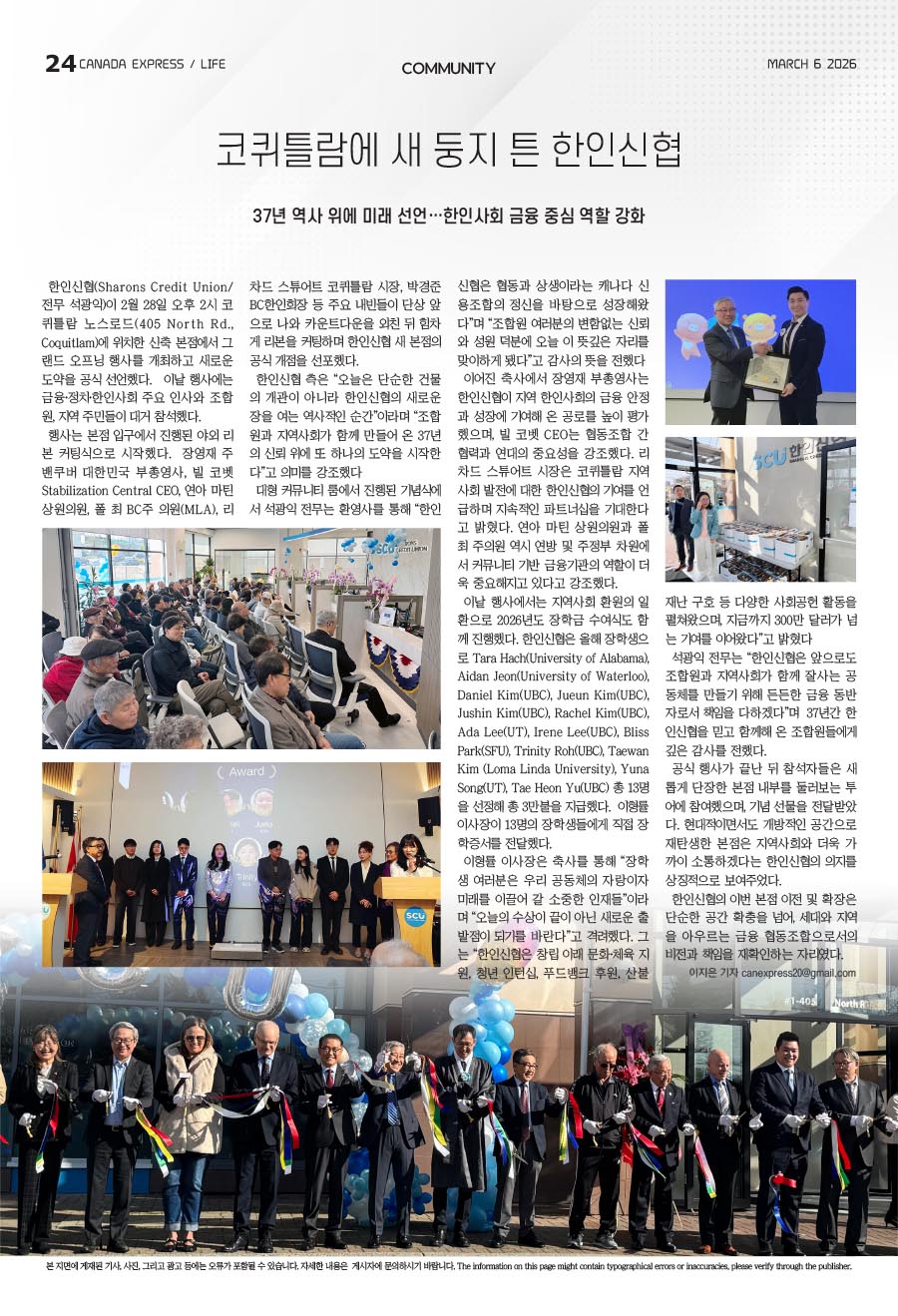 한인신협(Sharons Credit Union/ 전무 석광익)이 2월 28일 오후 2시 코퀴틀람 노스로드(405 North Rd., Coquitlam)에 위치한 신축 본점에서 그랜드 오프닝 행사를 개최하고 새로운 도약을 공식 선언했다. 이날 행사에는 금융·정치·한인사회 주요 인사와 조합원, 지역 주민들이 대거 참석했다.