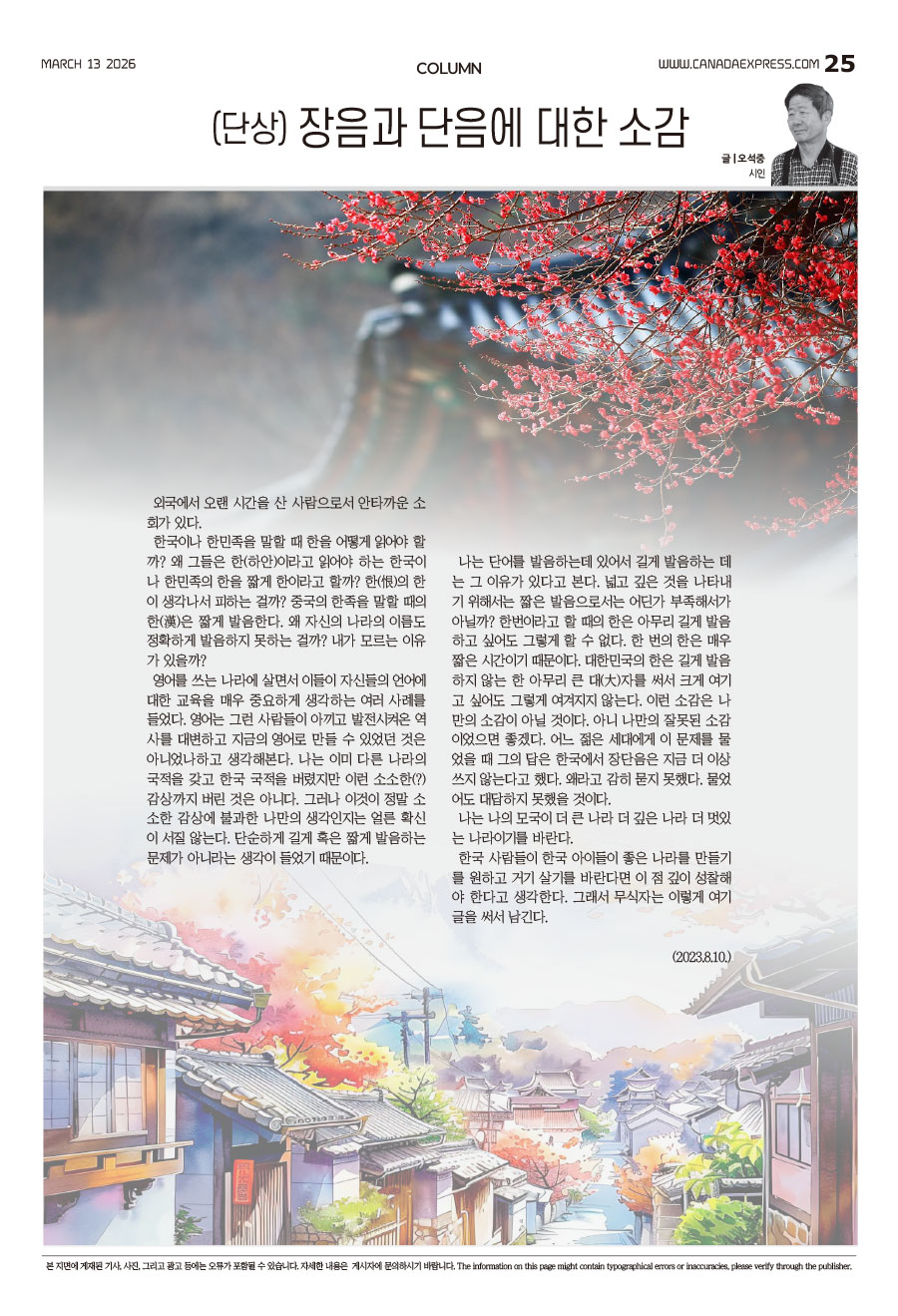 영어를 쓰는 나라에 살면서 이들이 자신들의 언어에 대한 교육을 매우 중요하게 생각하는 여러 사례를 들었다. 영어는 그런 사람들이 아끼고 발전시켜온 역사를 대변하고 지금의 영어로 만들 수 있었던 것은 아니었나하고 생각해본다. 나는 이미 다른 나라의 국적을 갖고 한국 국적을 버렸지만 이런 소소한(?) 감상까지 버린 것은 아니다. 그러나 이것이 정말 소소한 감상에 불과한 나만의 생각인지는 얼른 확신이 서질 않는다. 단순하게 길게 혹은 짧게 발음하는 문제가 아니라는 생각이 들었기 때문이다.
