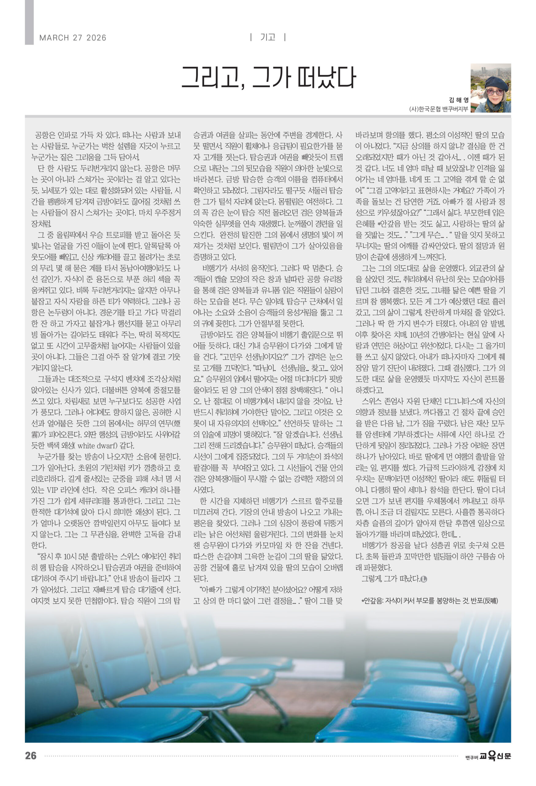 “잠시 후 10시 5분 출발하는 스위스 에어라인 취리히 행 탑승을 시작하오니 탑승권과 여권을 준비하여 대기하여 주시기 바랍니다.” 안내 방송이 들리자 그가 일어섰다. 그리고 재빠르게 탑승 대기줄에 선다. 여지껏 보지 못한 민첩함이다. 탑승 직원이 그의 탑승권과 여권을 살피는 동안에 주변을 경계한다. 사뭇 떨면서. 직원이 휠체어나 응급팀이 필요한가를 묻자 고개를 젓는다. 탑승권과 여권을 빼앗듯이 트랩으로 내닫는 그의 뒷모습을 직원이 의아한 눈빛으로 바라본다. 금방 탑승한 승객의 이름을 컴퓨터에서 확인하고 되뇌었다. 그림자라도 떨구듯 서둘러 탑승한 그가 털석 자리에 앉는다. 몸떨림은 여전하다. 그의 꼭 감은 눈이 탑승 직전 몰려오던 검은 양복들과 익숙한 실루엣을 연속 재생했다. 눈꺼풀이 경련을 일으킨다. 완전히 탈진한 그의 몸에서 생명의 빛이 꺼져가는 것처럼 보인다. 떨림만이 그가 살아있음을 증명하고 있다.