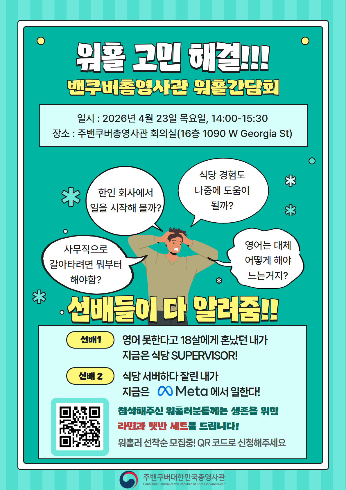 총영사관은 오는 4월 23일(목) 오후 2시부터 3시 30분까지 총영사관 회의실에서 워킹홀리데이 청년 대상 ‘워홀 고민 해결’ 간담회를 개최한다. 이번 행사는 취업, 영어, 직무 전환 등 현지 생활에서 겪는 현실적인 고민을 선배들의 경험을 통해 해결할 수 있도록 돕기 위해 마련됐다.