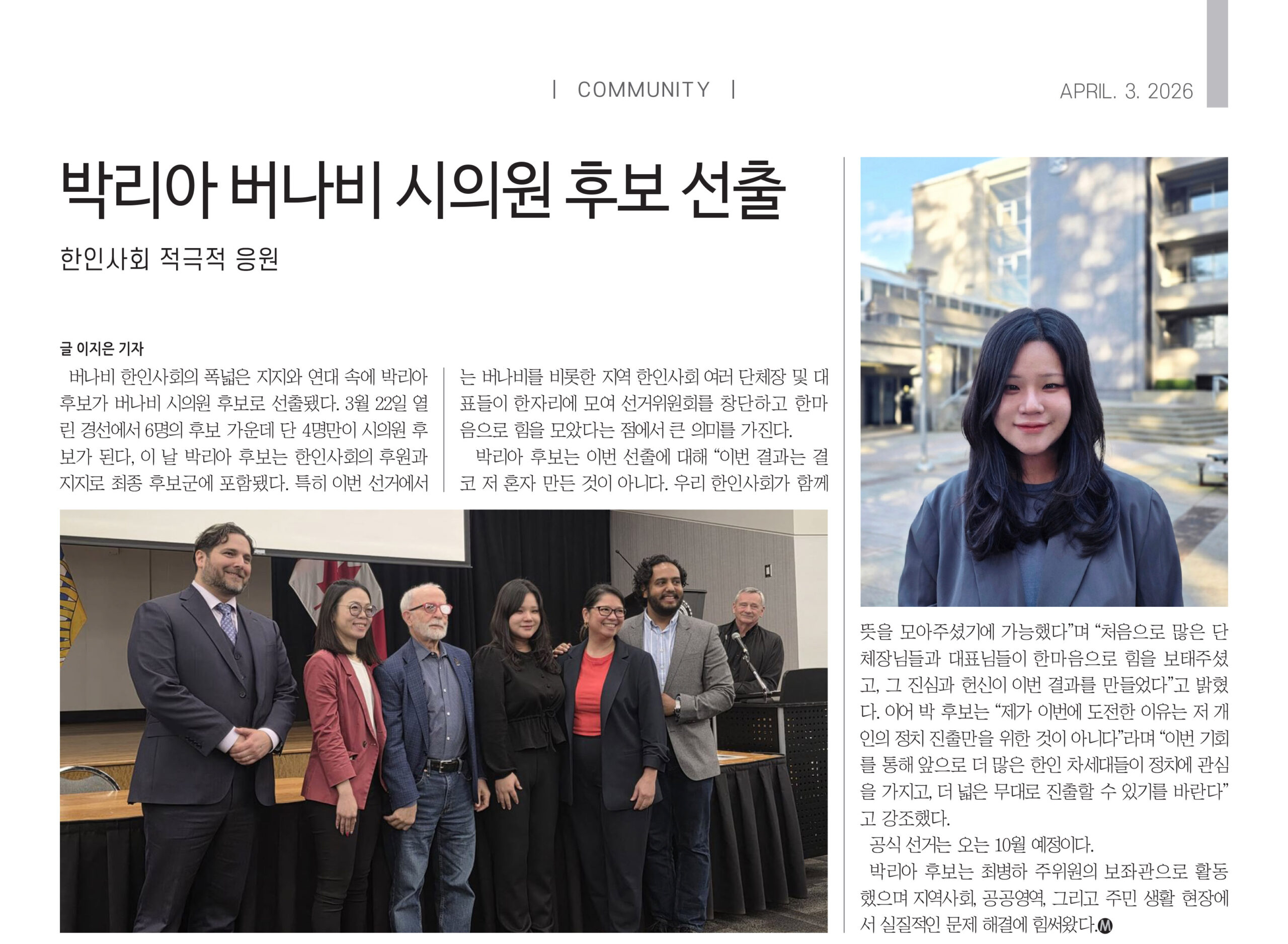 버나비 한인사회의 폭넓은 지지와 연대 속에 박리아 후보가 버나비 시의원 후보로 선출됐다. 3월 22일 열린 경선에서 6명의 후보 가운데 단 4명만이 시의원 후보가 된다, 이 날 박리아 후보는 한인사회의 후원과 지지로 최종 후보군에 포함됐다. 특히 이번 선거에서는 버나비를 비롯한 지역 한인사회 여러 단체장 및 대표들이 한자리에 모여 선거위원회를 창단하고 한마음으로 힘을 모았다는 점에서 큰 의미를 가진다.
