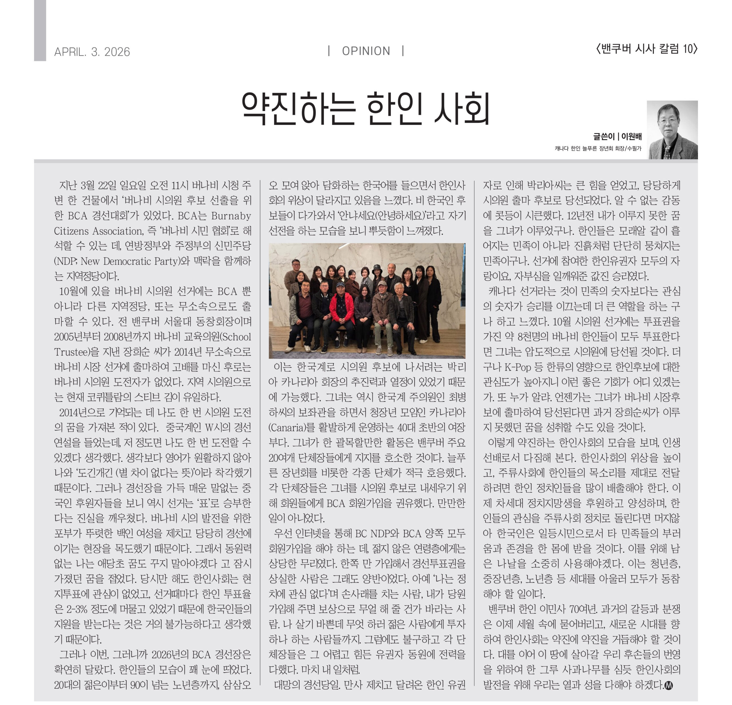 이렇게 약진하는 한인사회의 모습을 보며, 인생선배로서 다짐해 본다. 한인사회의 위상을 높이고, 주류사회에 한인들의 목소리를 제대로 전달하려면 한인 정치인들을 많이 배출해야 한다. 이제 차세대 정치지망생을 후원하고 양성하며, 한인들의 관심을 주류사회 정치로 돌린다면 머지않아 한국인은 일등시민으로서 타 민족들의 부러움과 존경을 한 몸에 받을 것이다. 이를 위해 남은 나날을 소중히 사용해야겠다. 이는 청년층, 중장년층, 노년층 등 세대를 아울러 모두가 동참해야 할 일이다. 밴쿠버 한인 이민사 70여년. 과거의 갈등과 분쟁은 이제 세월 속에 묻어버리고, 새로운 시대를 향하여 한인사회는 약진에 약진을 거듭해야 할 것이다. 대를 이어 이 땅에 살아갈 우리 후손들의 번영을 위하여 한 그루 사과나무를 심듯 한인사회의 발전을 위해 우리는 열과 성을 다해야 하겠다.