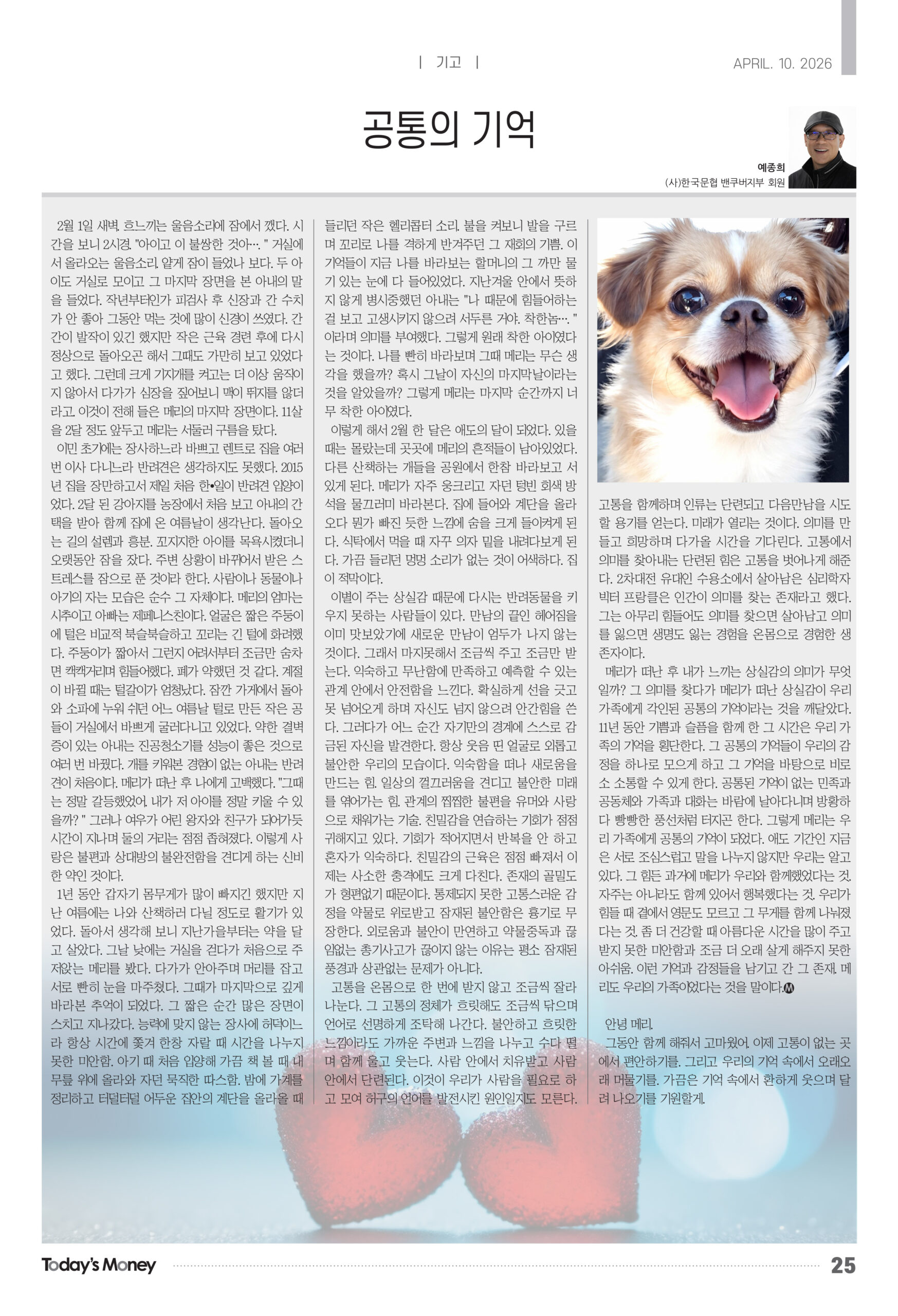 그동안 함께 해줘서 고마웠어. 이제 고통이 없는 곳에서 편안하기를. 그리고 우리의 기억 속에서 오래오래 머물기를. 가끔은 기억 속에서 환하게 웃으며 달려 나오기를 기원할게.