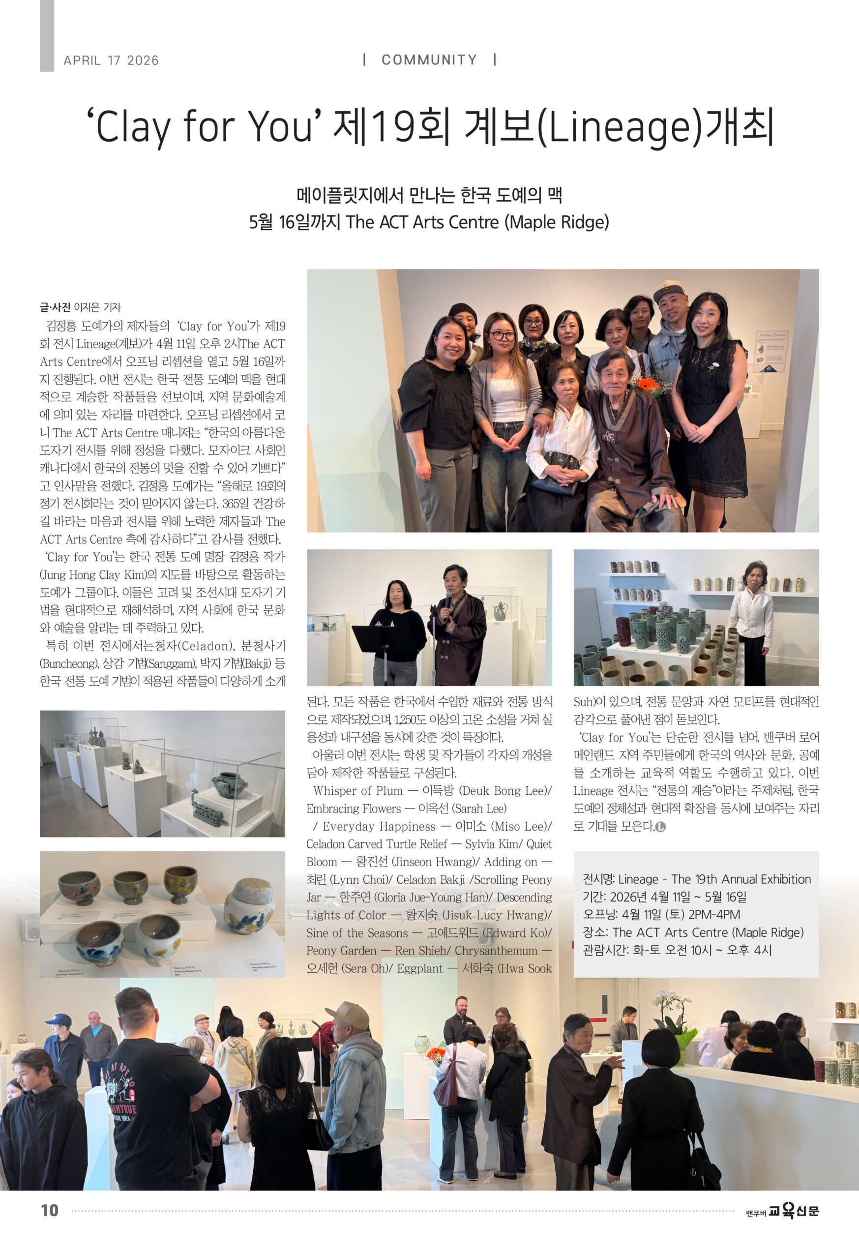 ‘Clay for You’는 단순한 전시를 넘어, 밴쿠버 로어 메인랜드 지역 주민들에게 한국의 역사와 문화, 공예를 소개하는 교육적 역할도 수행하고 있다. 이번 Lineage 전시는 “전통의 계승”이라는 주제처럼, 한국 도예의 정체성과 현대적 확장을 동시에 보여주는 자리로 기대를 모은다.