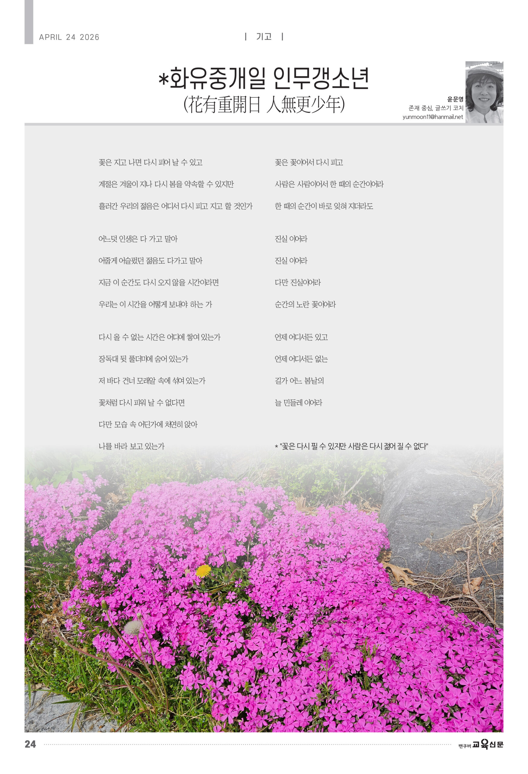 * “꽃은 다시 필 수 있지만 사람은 다시 젊어 질 수 없다”