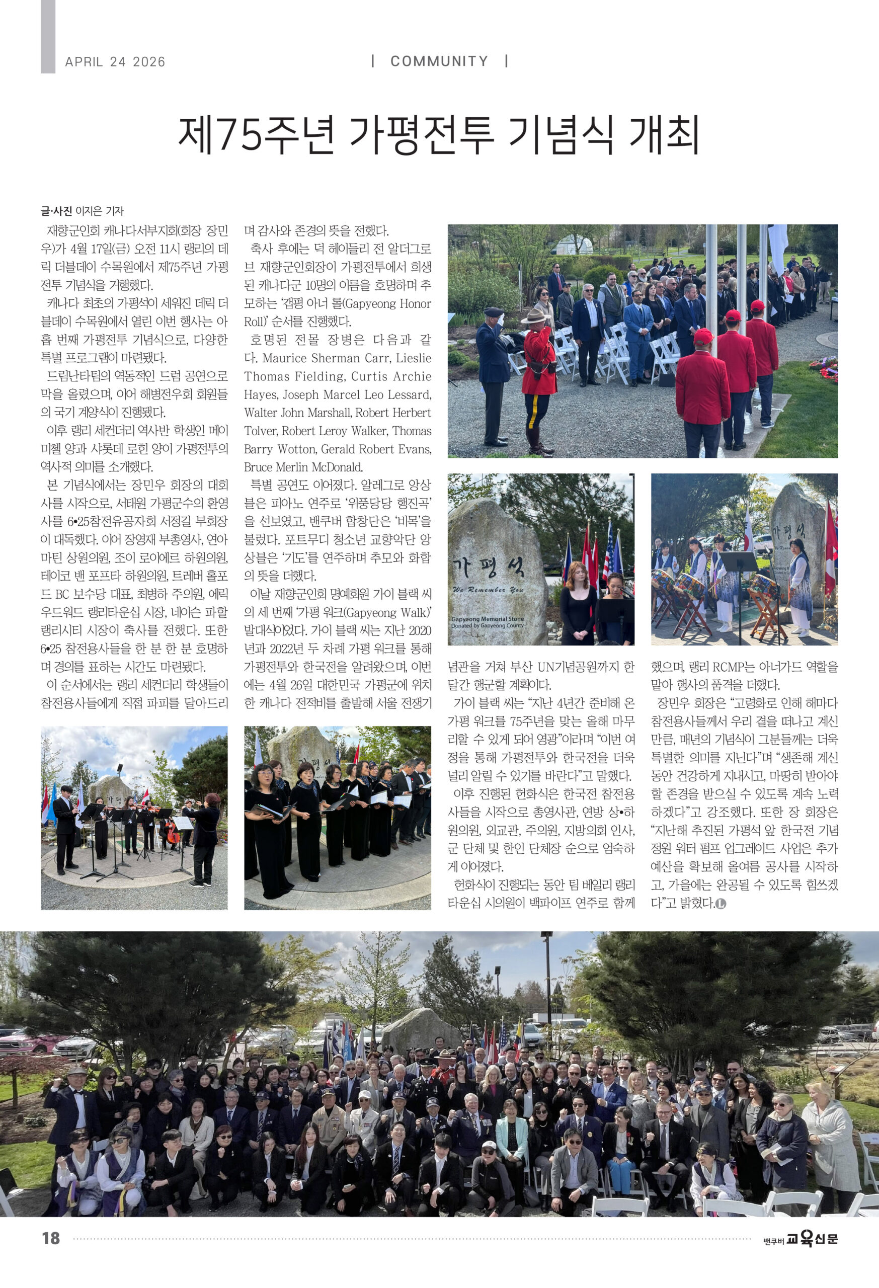 재향군인회 캐나다서부지회(회장 장민우)가 4월 17일(금) 오전 11시 랭리의 데릭 더블데이 수목원에서 제75주년 가평전투 기념식을 거행했다.
