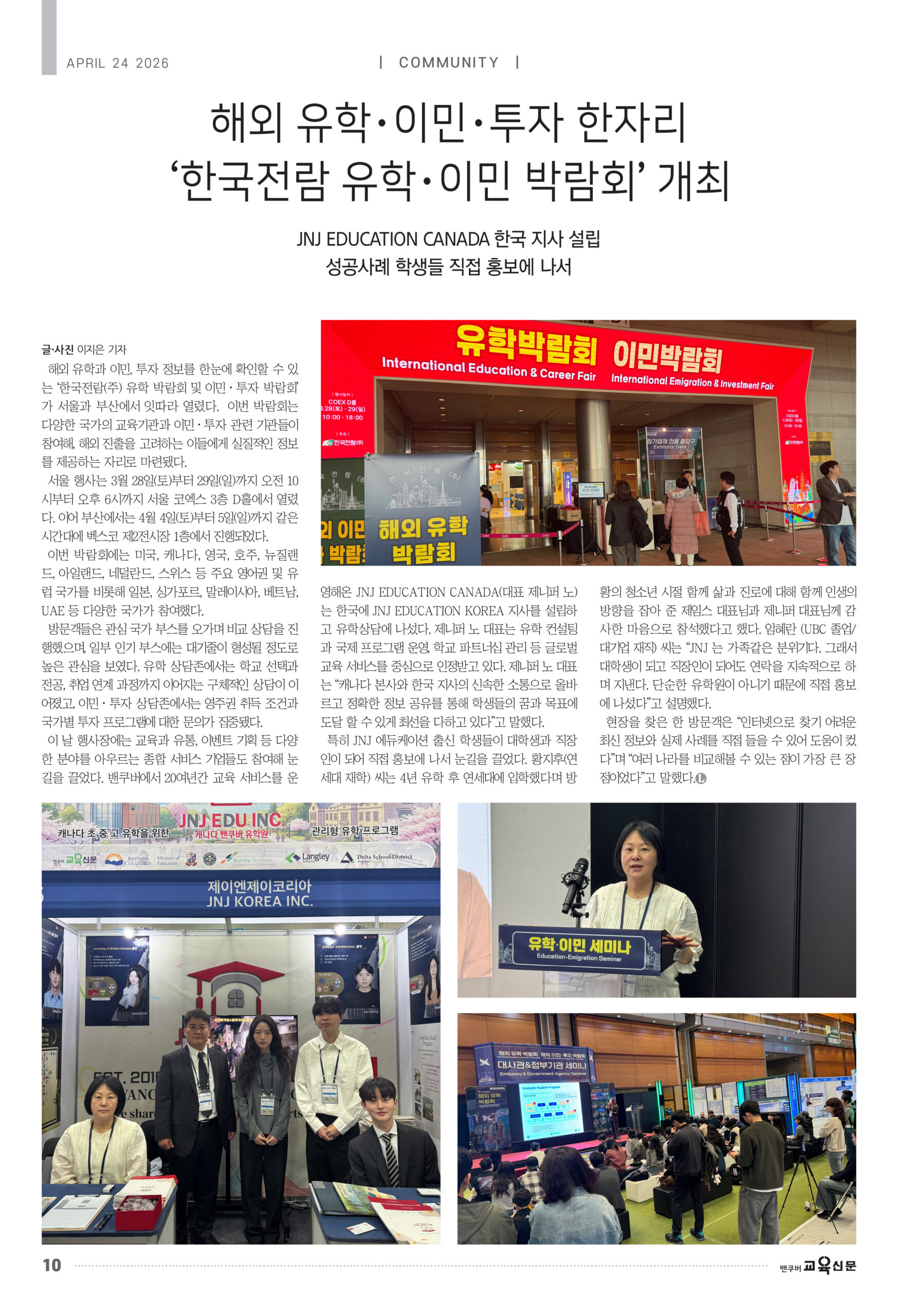 이 날 행사장에는 교육과 유통, 이벤트 기획 등 다양한 분야를 아우르는 종합 서비스 기업들도 참여해 눈길을 끌었다. 밴쿠버에서 20여년간 교육 서비스를 운영해온 JNJ EDUCATION CANADA(대표 제니퍼 노)는 한국에 JNJ EDUCATION KOREA 지사를 설립하고 유학상담에 나섰다. 제니퍼 노 대표는 유학 컨설팅과 국제 프로그램 운영, 학교 파트너십 관리 등 글로벌 교육 서비스를 중심으로 인정받고 있다. 제니퍼 노 대표는 “캐나다 본사와 한국 지사의 신속한 소통으로 올바르고 정확한 정보 공유를 통해 학생들의 꿈과 목표에 도달 할 수 있게 최선을 다하고 있다”고 말했다.