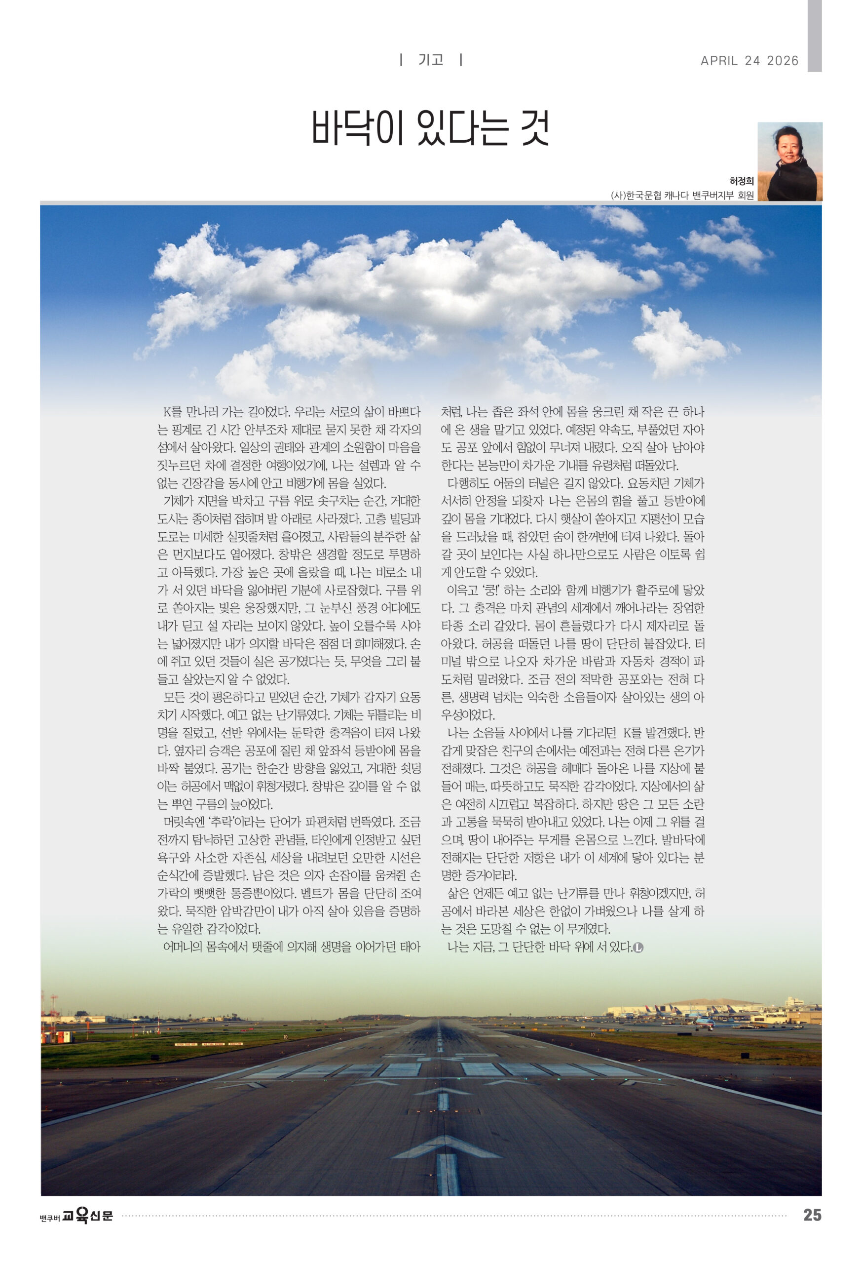 이윽고 ‘쿵!’ 하는 소리와 함께 비행기가 활주로에 닿았다. 그 충격은 마치 관념의 세계에서 깨어나라는 장엄한 타종 소리 같았다. 몸이 흔들렸다가 다시 제자리로 돌아왔다. 허공을 떠돌던 나를 땅이 단단히 붙잡았다. 터미널 밖으로 나오자 차가운 바람과 자동차 경적이 파도처럼 밀려왔다. 조금 전의 적막한 공포와는 전혀 다른, 생명력 넘치는 익숙한 소음들이자 살아있는 생의 아우성이었다.