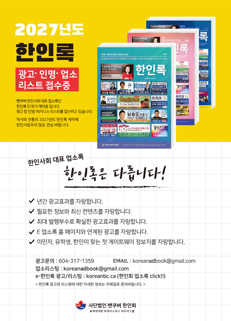 비즈니스 리스트 상호(한글)* 상호(영어)* 업종* 이메일* 홈페이지 전화번호* 주소 * 시(City)* Postal Code* 4 + 11 = 보내기 한인록 리스트 이름(한글)* 이메일* 전화번호* 주소 시(City) Postal Code 10 + 7 = 보내기