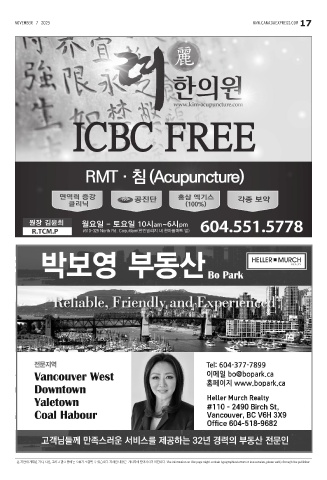 NOVEMBER 7 2025 WWW.CANADAEXPRESS.COM 17 본 지면에 게재된 기사, 사진, 그리고 광고 등에는 오류가 포함될 수 있습니다. 자세한 내용은 게시자에 문의하시기 바랍니다. The information on this page might contain typographical errors or inaccuracies, please verify through the publisher.