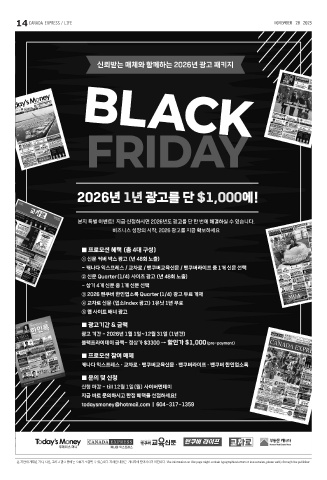 14 CANADA EXPRESS / LIFE NOVEMBER 28 2025 본 지면에 게재된 기사, 사진, 그리고 광고 등에는 오류가 포함될 수 있습니다. 자세한 내용은 게시자에 문의하시기 바랍니다. The information on this page might contain typographical errors or inaccuracies, please verify through the publisher.